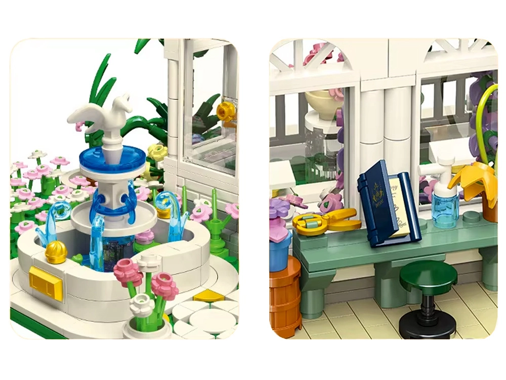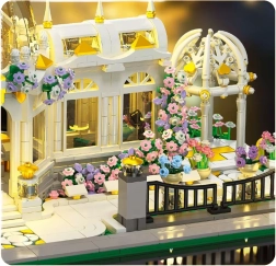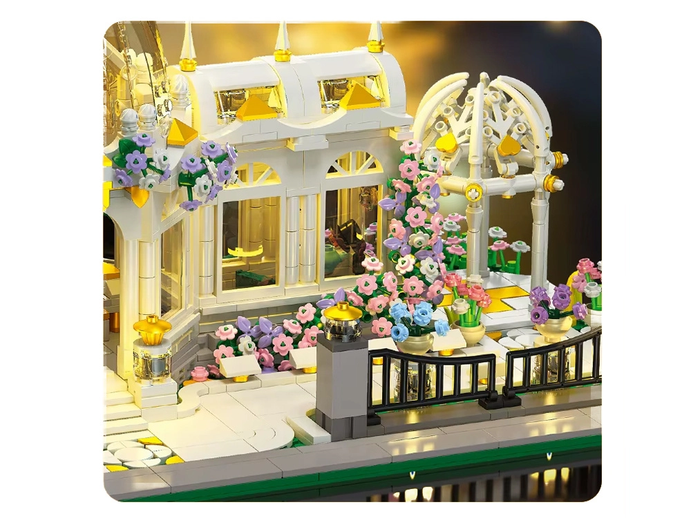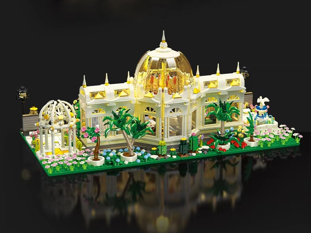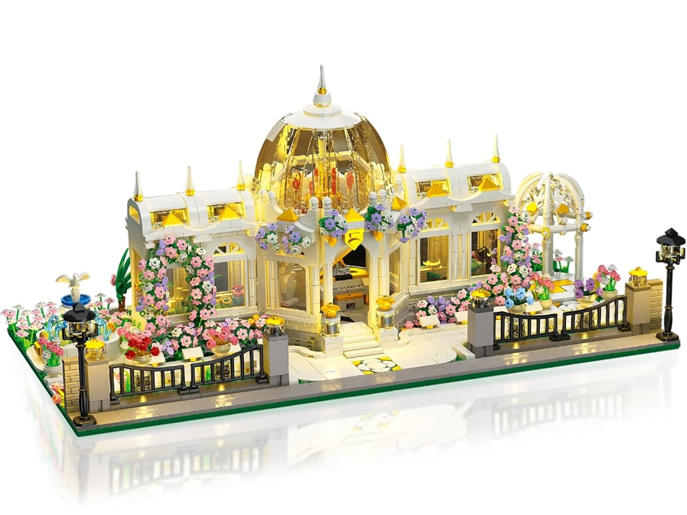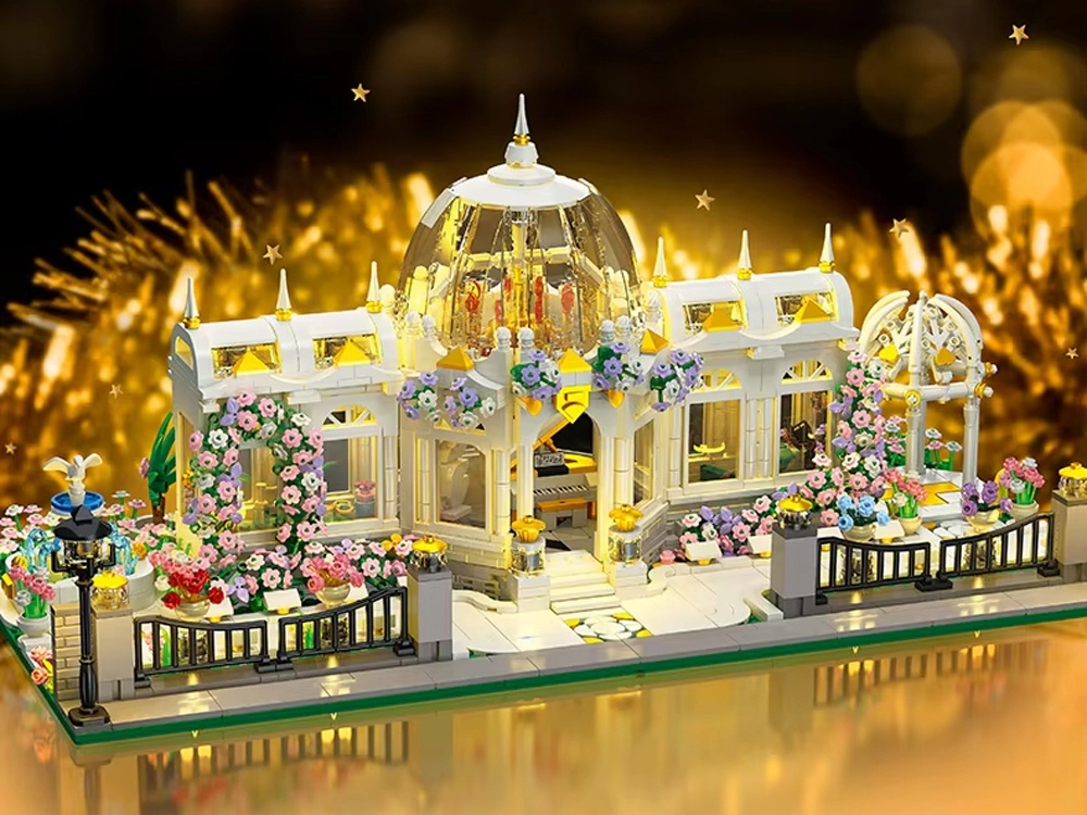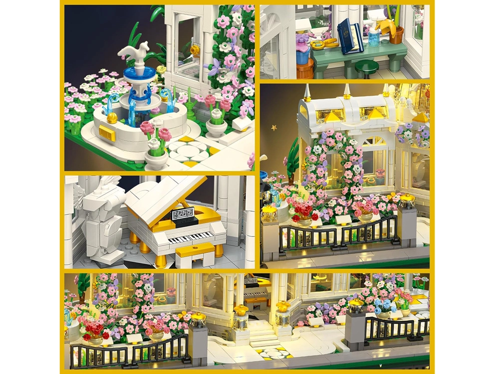 Modelis iepriecinās prasīgus būvētājus: te atradīsiet elegantas kolonnas un balustrādes ar zelta akcentiem, reālistiskus celiņus, veramas durvis un daudz aksesuāru – no galdiņa ar grāmatu un šķērēm līdz fortepiānam un sīkām dekorācijām. Vakara noskaņu papildina LED apgaismojums, kas izgaismo kupolu un logus, radot ziemas dārza efektu.