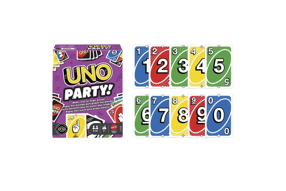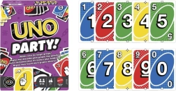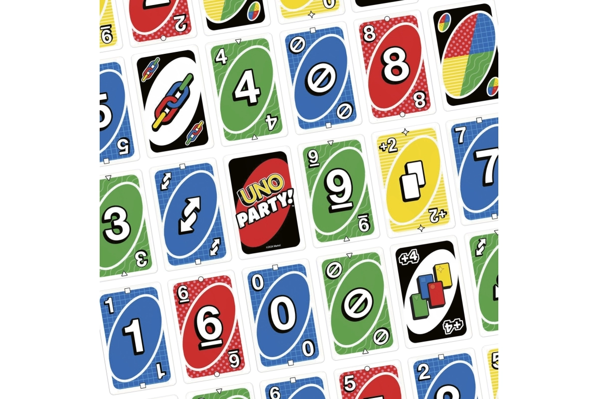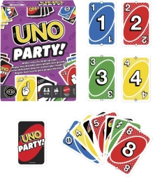 UNO Party piedāvā pārbaudītu iemīļotās UNO spēles spēlējamību lielākā un skaļākā komplektācijā – ideāli ballītēm, ģimenes svinībām un vakariem ar draugiem. Pateicoties 168 kārtīm (1,5× klasiskā kavu), spēli var baudīt vairāk spēlētāju un spriedze saglabājas ilgāk.