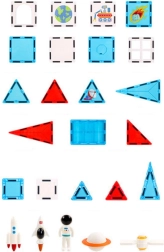 Spēcīgie magnēti nodrošina drošu detaļu savienojumu, tāpēc konstrukcijas labi saglabā formu. Kosmosa tematikas komplektā ir astronauta figūriņa, raķete un dekoratīvas flīzes, kas attīsta iztēli un dabiski veicina radošu rotaļu, telpisko uztveri un manuālās prasmes.