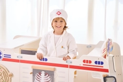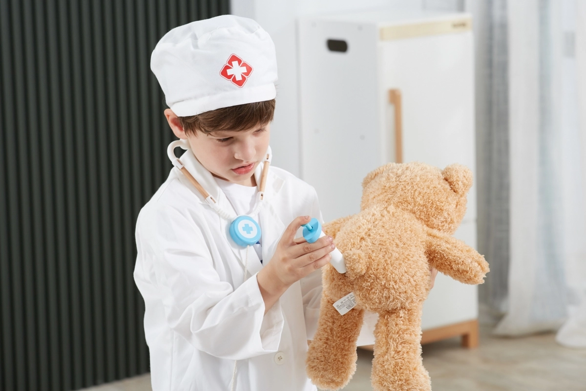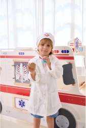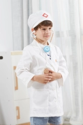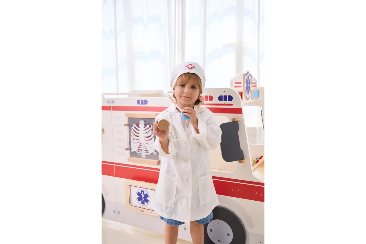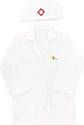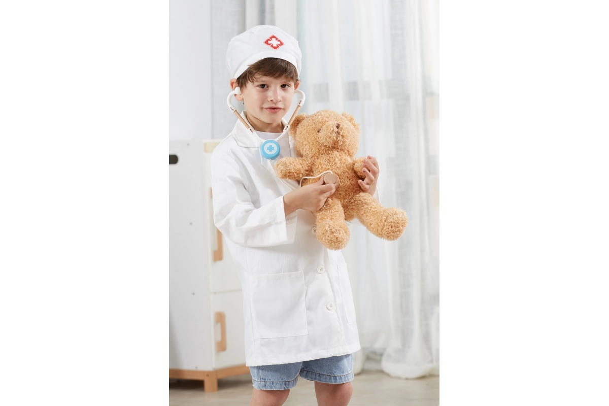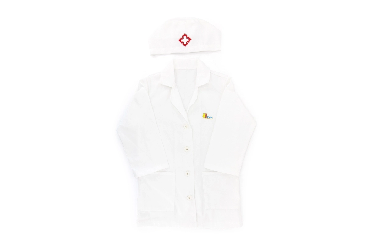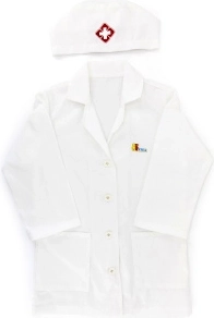 Baltais halāts un cepure ar medicīnas simbolu veicina bērnu iztēli un piešķir spēlei reālistisku noskaņu.