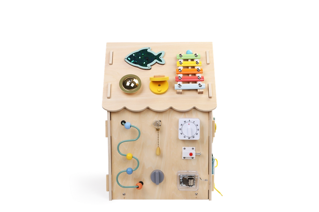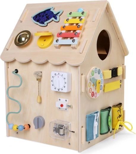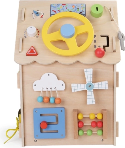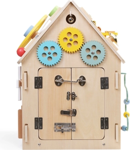 Koka aktīvais namiņš apvieno spēli un mācīšanos vienā. Tas piedāvā zobratus, stūri un pārnesumu sviru, skaitīkli, labirintu, rotējošu vēja ratu un dažādus slēdzeņu un aizbīdņu veidus, kas attīsta sīko motoriku, loģiku un patstāvību. Izgatavots no kvalitatīvas dabīgas koksnes ar drošām, gludām malām un netoksiskām krāsām. Lieliska izvēle zinātkāriem bērniem no 3 gadu vecuma.