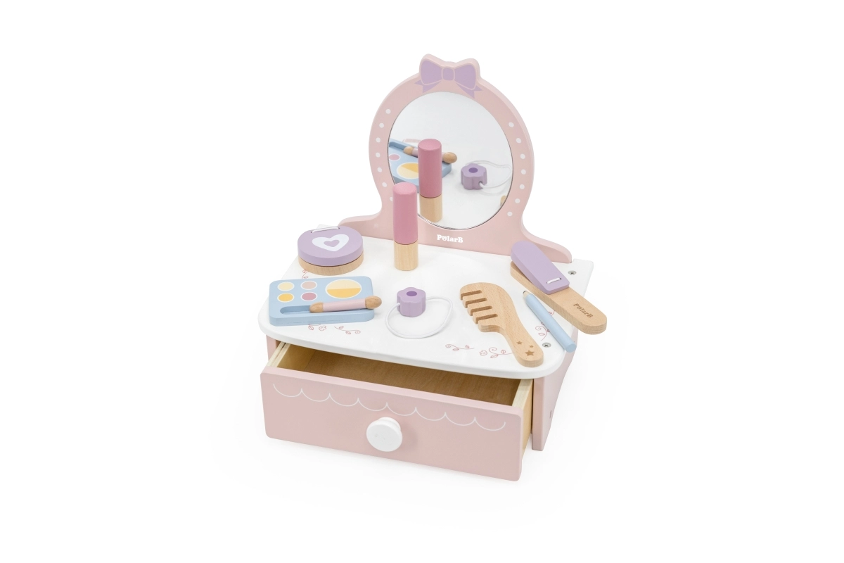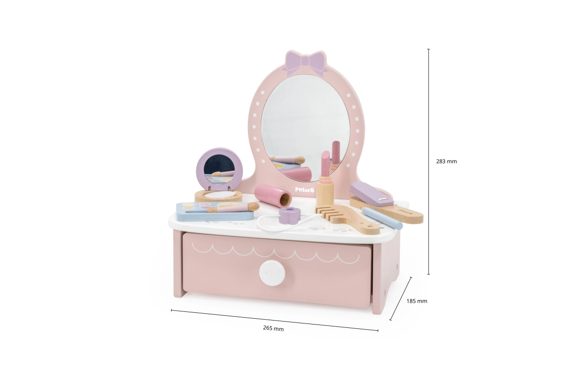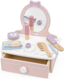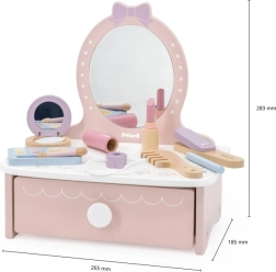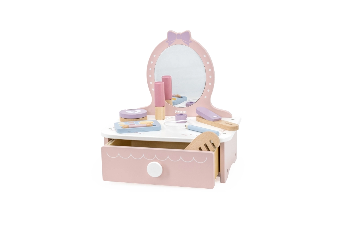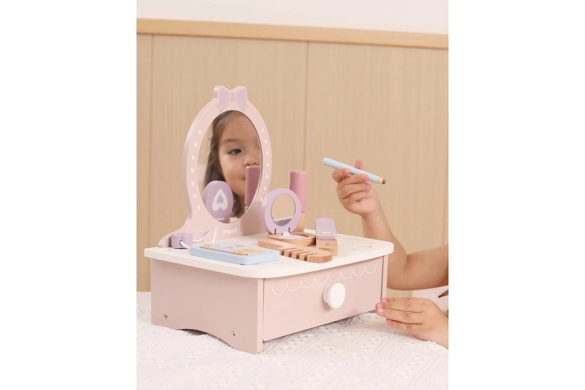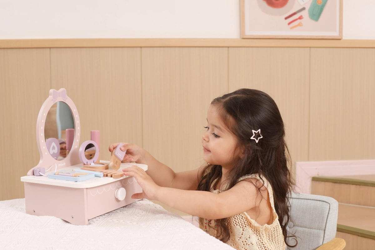 Šis mīlīgais koka tualetes galdiņš ir lielisks papildinājums jebkurai bērnu istabai. Veicina fantāziju, sociālās lomas spēles un sīko motoriku. Pateicoties izturīgajai koka konstrukcijai, tas ir drošs un ilgmūžīgs ikdienas rotaļām.