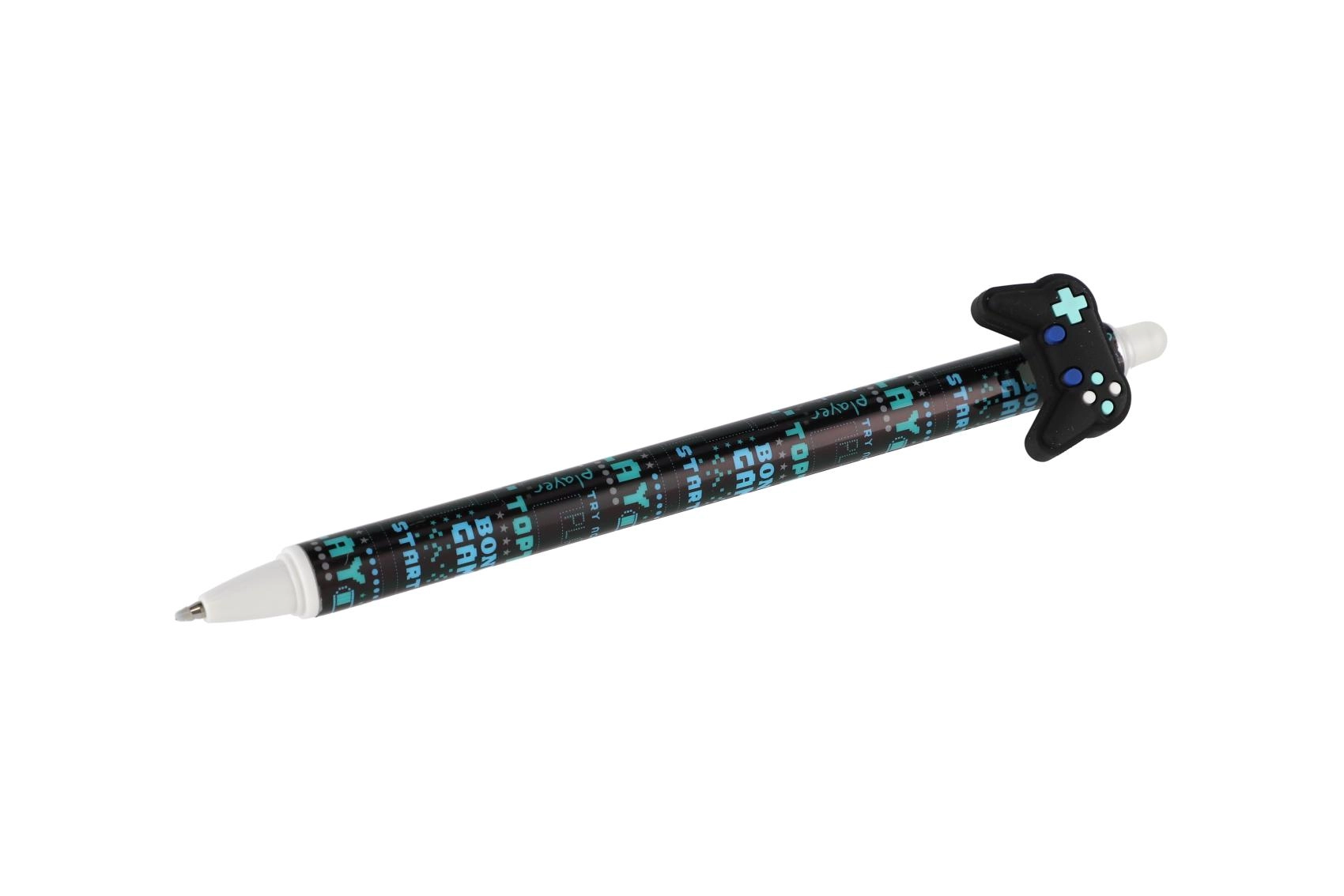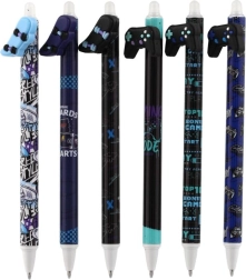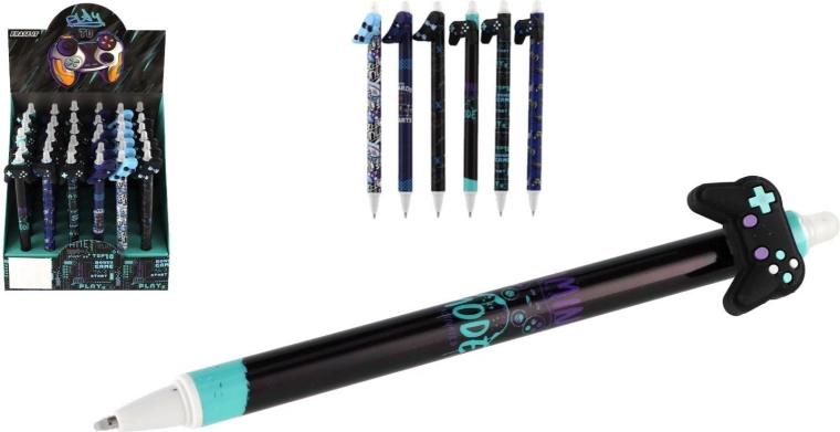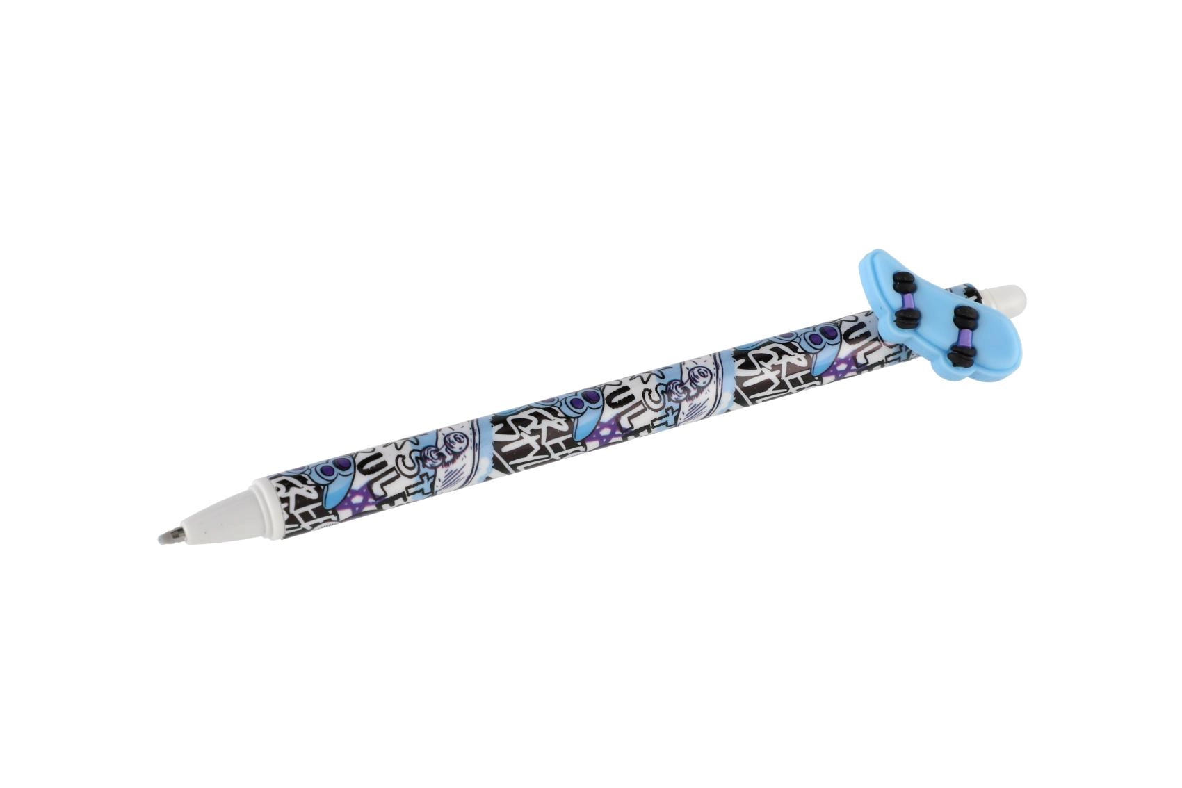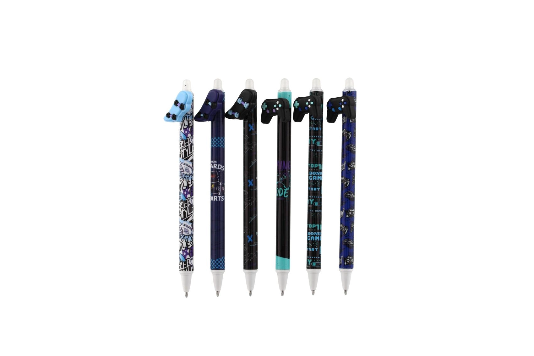 Katrai pildspalvai ir oriģināls toppers spēļu pults, skeitborda, tauriņa vai spārnu formā, un tā ir dekorēta ar moderniem melniem un ziliem rakstiem. Pateicoties izdzēšamajai tintei, sīkas kļūdas var viegli izlabot bez švīkām.