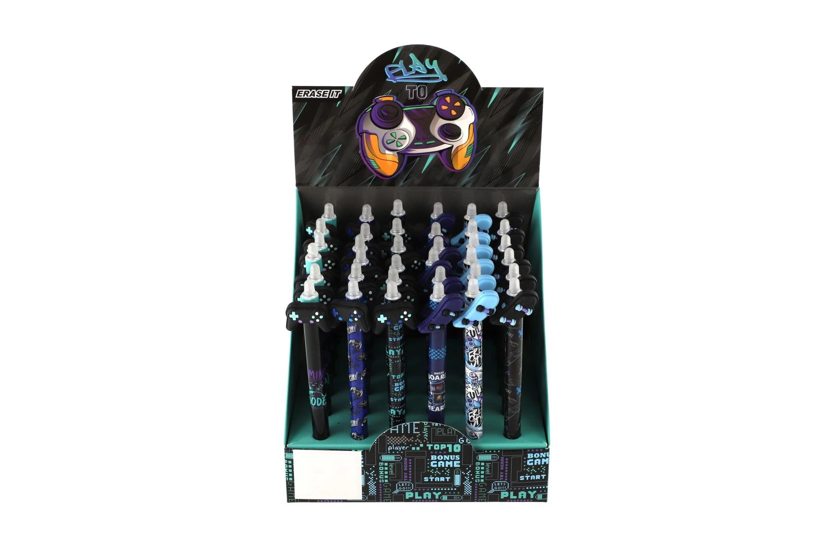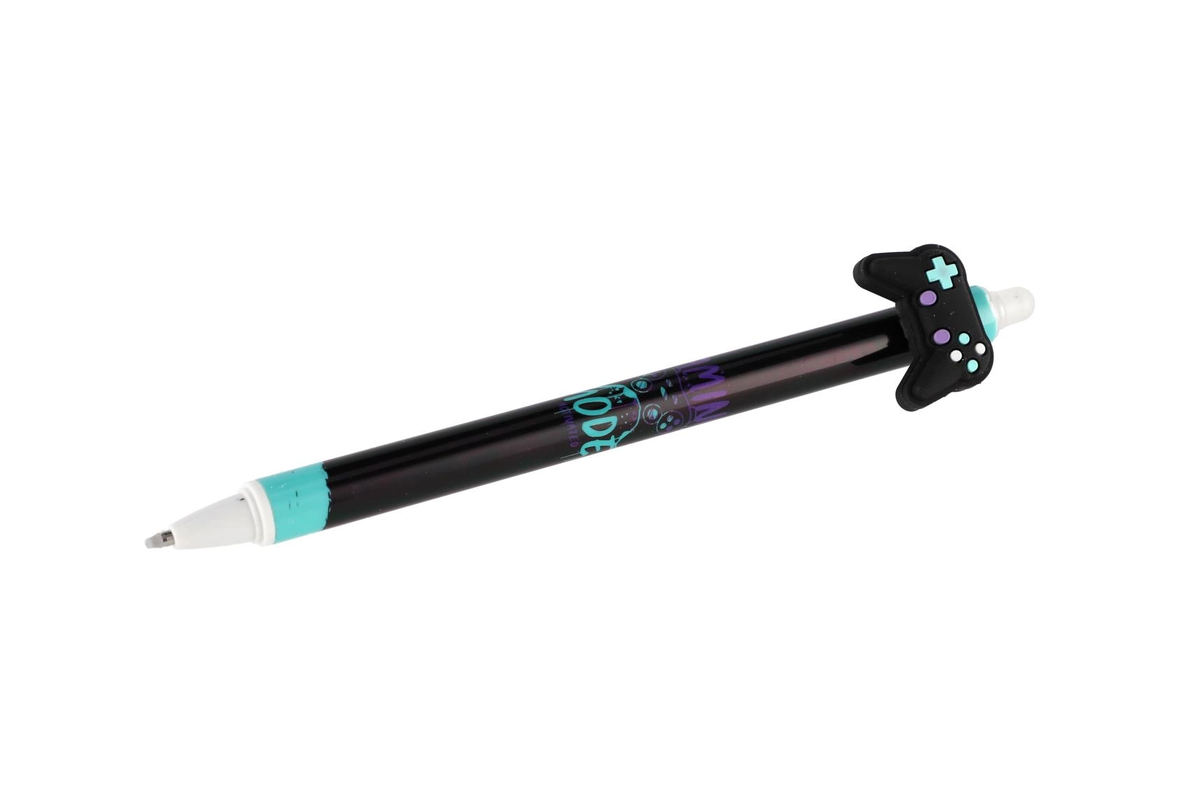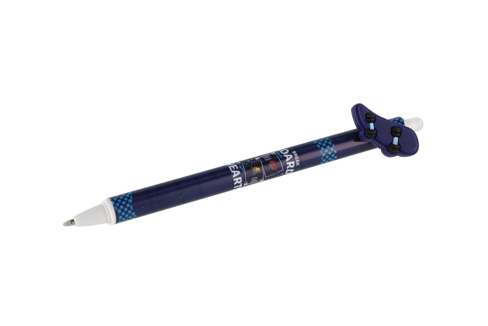 Katrai pildspalvai ir oriģināls toppers spēļu pults, skeitborda, tauriņa vai spārnu formā, un tā ir dekorēta ar moderniem melniem un ziliem rakstiem. Pateicoties izdzēšamajai tintei, sīkas kļūdas var viegli izlabot bez švīkām.