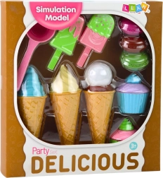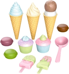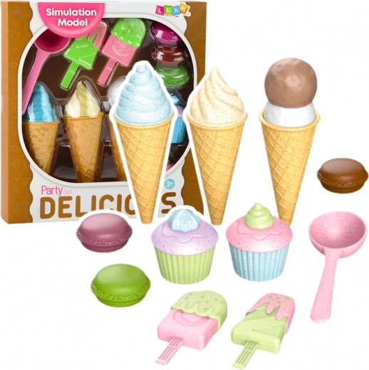 Krāsains saldējumu un desertu komplekts iepriecinās visus mazos konditorus. Komplektā ir korneti, saldējumi uz kociņa, kapkeiki, makarūni un saldējumu karote – viss no droša plastmasas. Veicina radošumu, sīkās motorikas attīstību un lomu spēles kafejnīcā vai saldējumu veikalā.