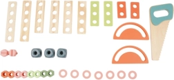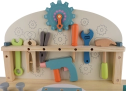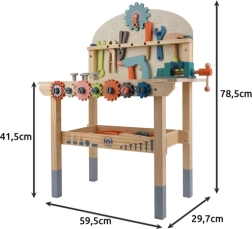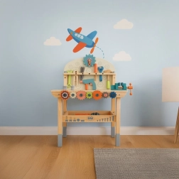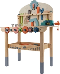 Komplektā ir bagātīgs instrumentu un savienotājelementu klāsts, kas attīsta sīko motoriku, roku–acu koordināciju un loģisko domāšanu. Praktiska apakšējā plaukts nodrošina vietu detaļu un piederumu glabāšanai. Lieliska dāvana, kas iepriecinās ikvienu mazo meistaru.