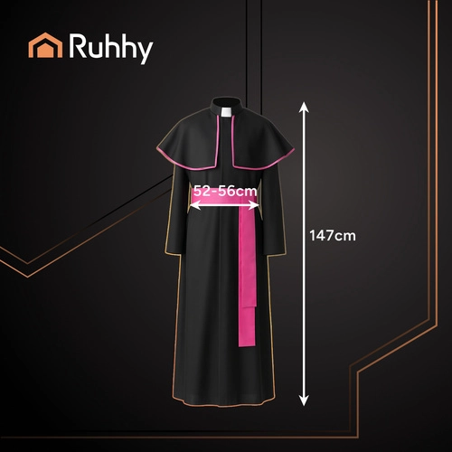 Komplektā ietilpst gara melna sutāna ar apkaklīti, pelerīna ar apdari un liturģiska josta, kas kopā veido izteiksmīgu un cienīgu izskatu. Pateicoties universālajam XL/XXL izmēram, tas ērti pielāgojas dažādām ķermeņa formām un lieliski der Helovīnam, masku ballēm, tematiskām ballītēm un skatuvei.