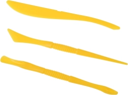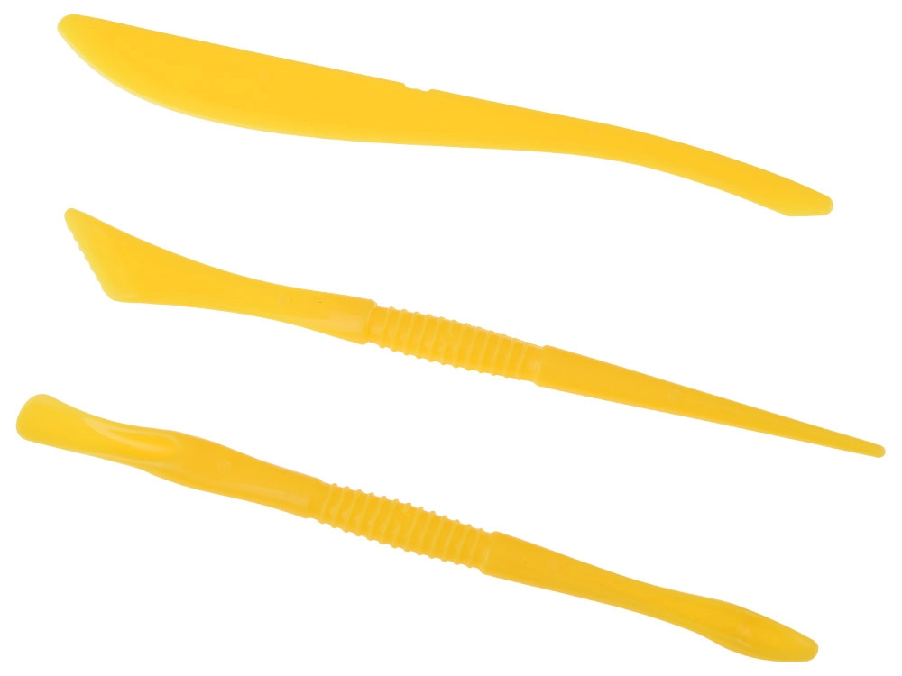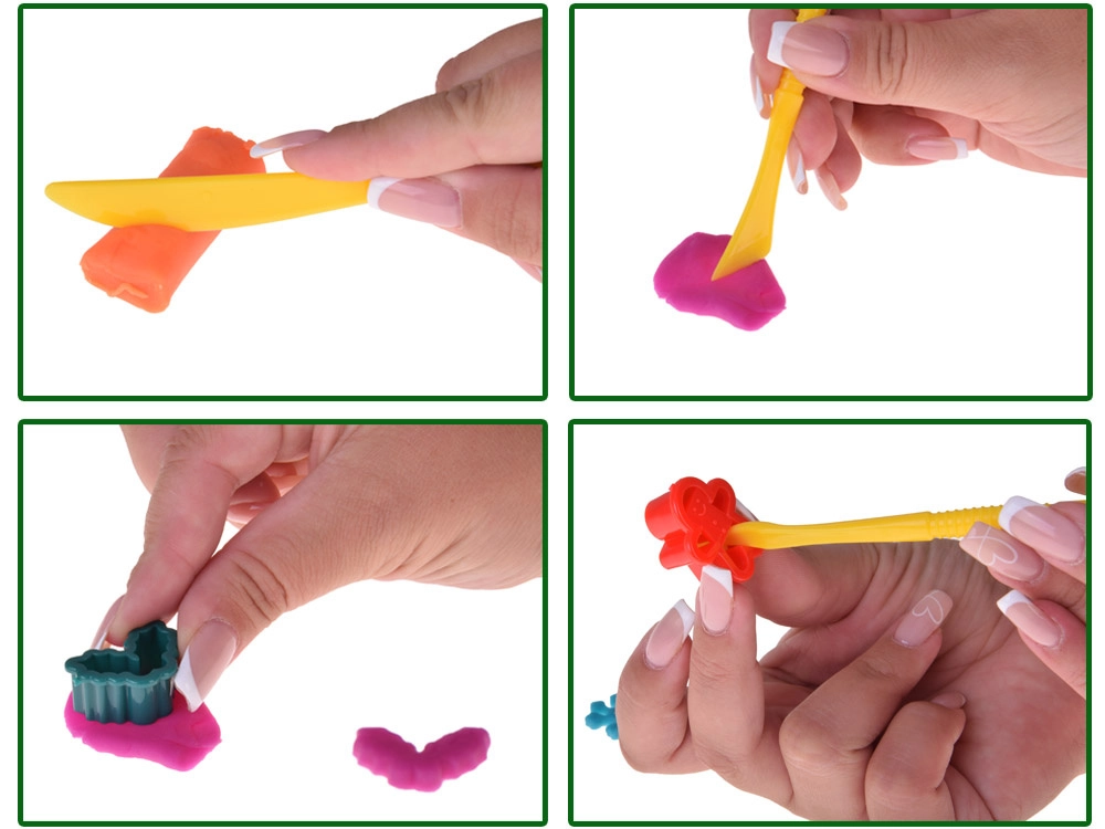 Iepakojumā iekļauti arī 3 droši plastmasas naži precīzai pārpalikumu nošķiršanai un detaļu izstrādei. Uz iepakojuma atradīsiet noderīgu krāsu ceļvedi, kas parāda, kādi toņi veidojas, sajaucot atsevišķas masas.
