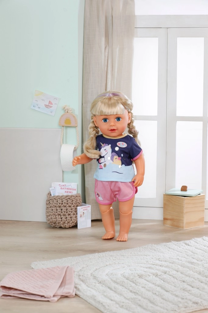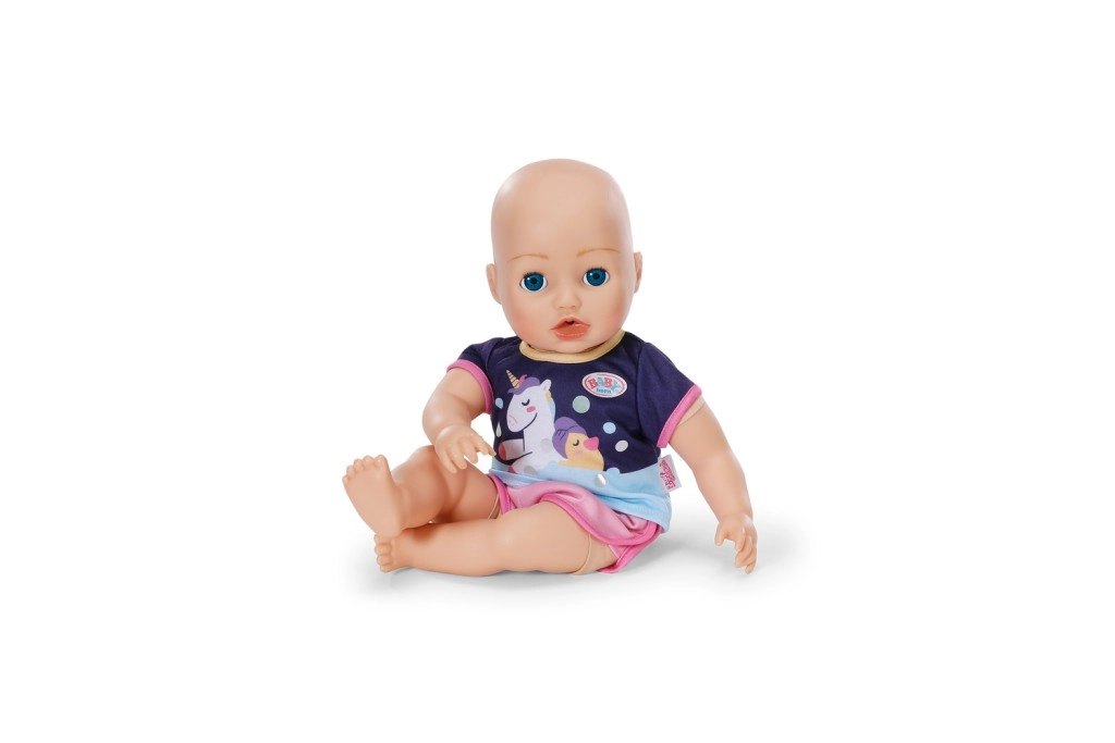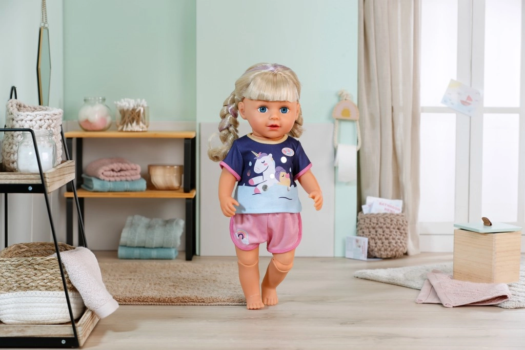Mīlīga divdaļīga BABY born pidžama 43 cm lellēm pārvērš katru iemigšanu par maģisku rituālu. Mīkstais materiāls un Easy Fit piegriezums nodrošina, ka tērpu ir viegli uzvilkt un novilkt, tas veicina pārvilkšanās spēles un attīsta bērnu iztēli un rūpēšanās prasmes. Stilīgais vienradža motīvs un jautras krāsas padara pidžamu par iemīļotu vakara mieram. Piemērots bērniem no 3 gadu vecuma.