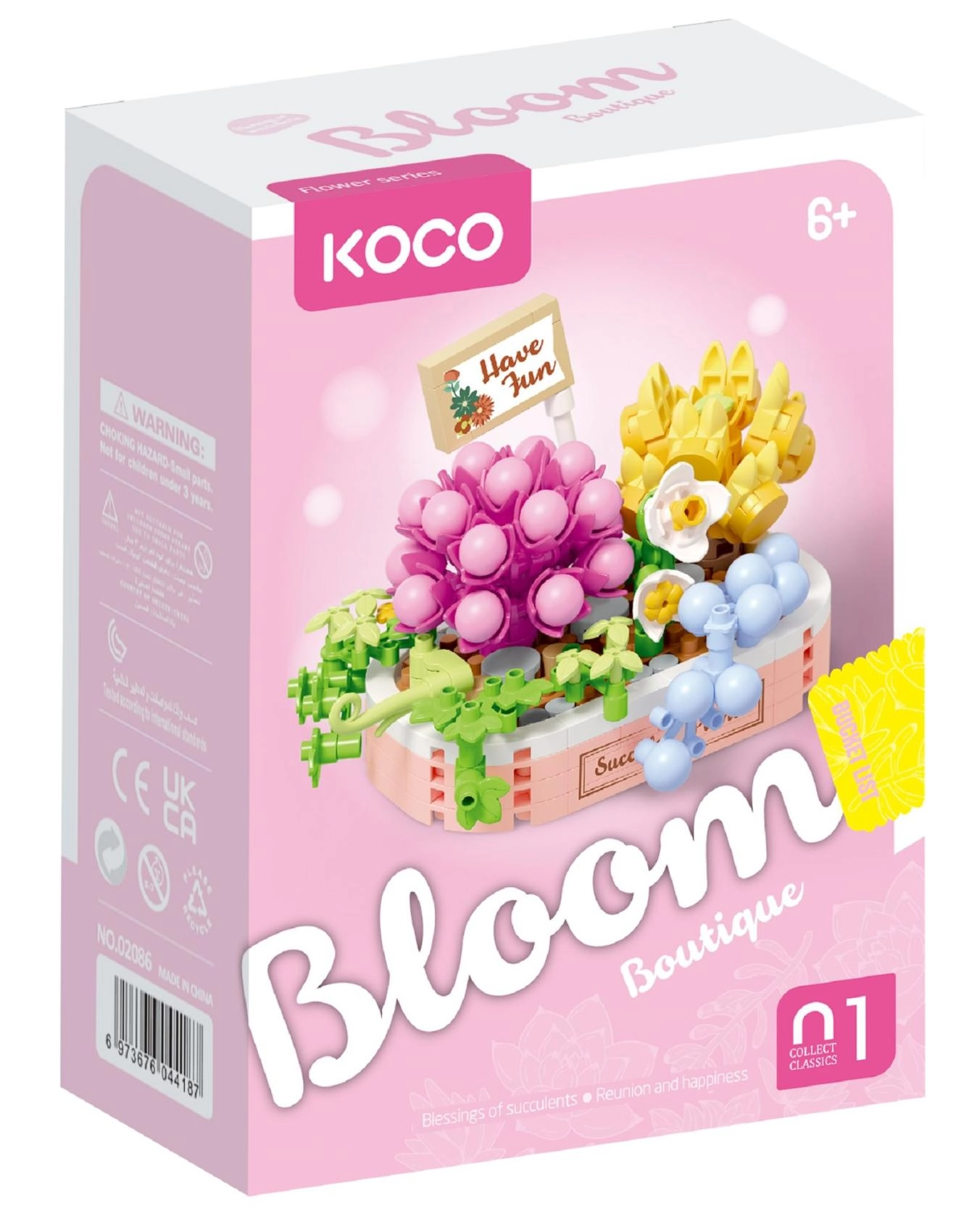 KOCO Bloom konstruktors sniedz prieku no radīšanas un skaistu rezultātu. No atsevišķām detaļām viegli saliksiet košus ziedus un sukulentus, kas kļūs par oriģinālu plaukta vai rakstāmgalda rotājumu. Pateicoties saprotamai salikšanai, izklaidi izbaudīs gan bērni, gan pieaugušie.