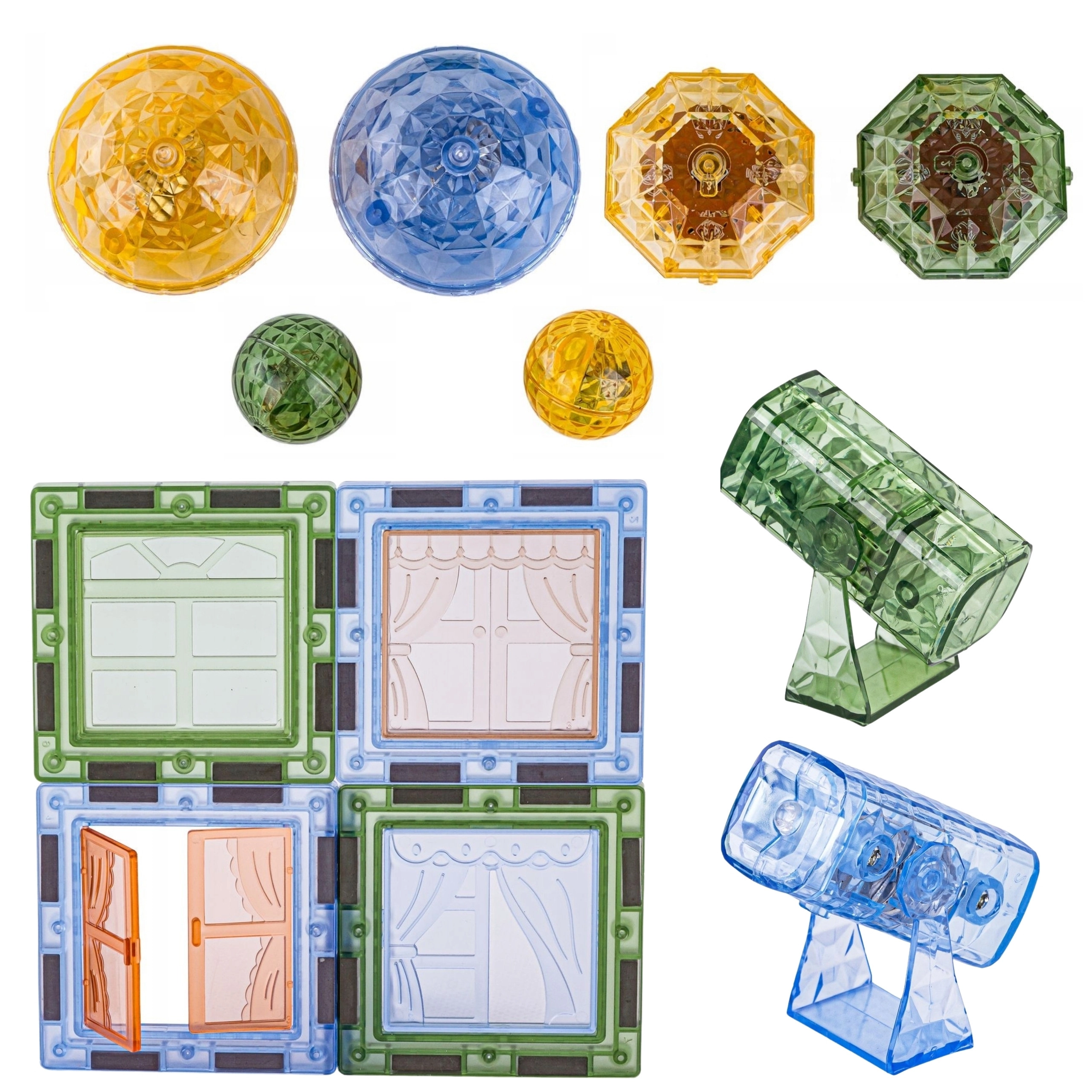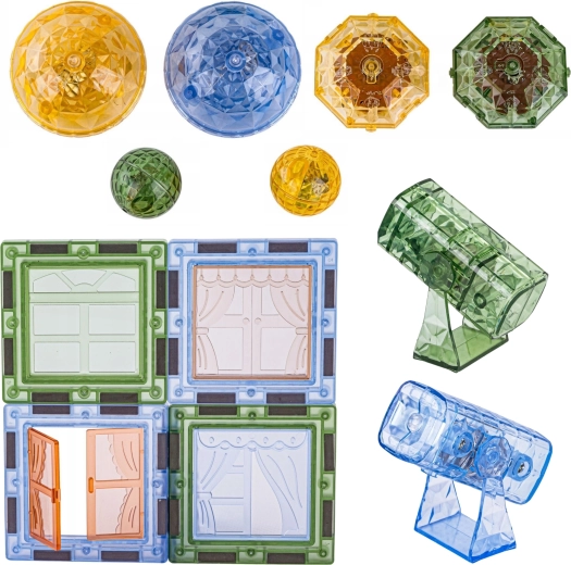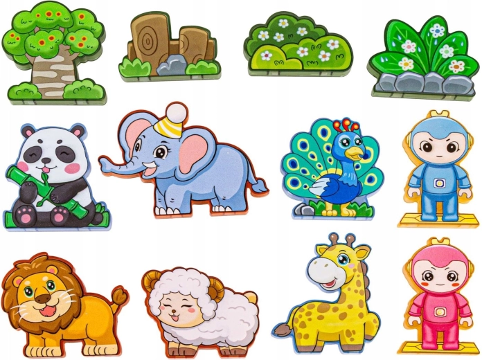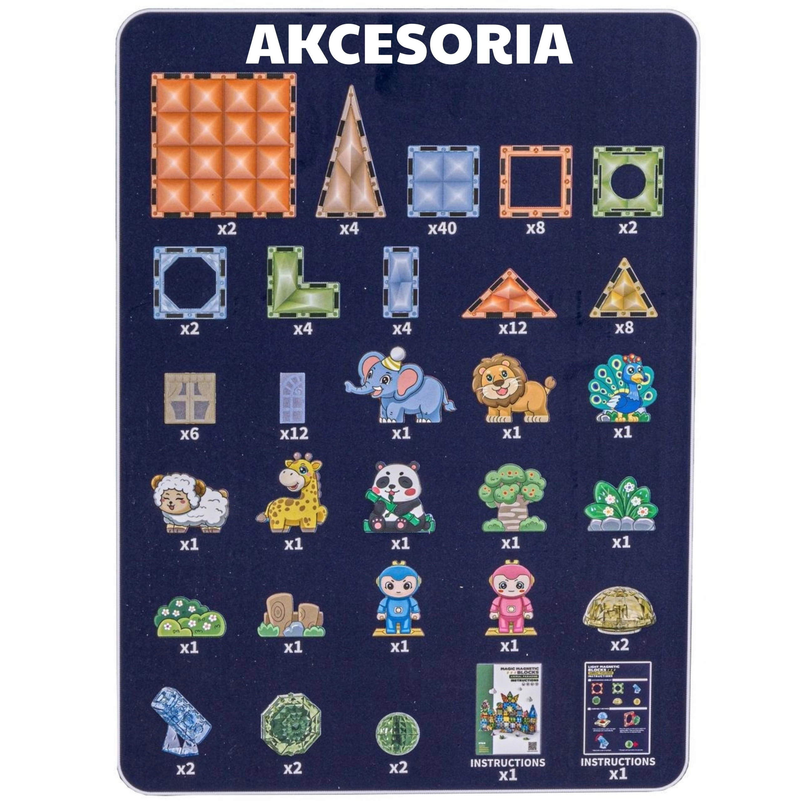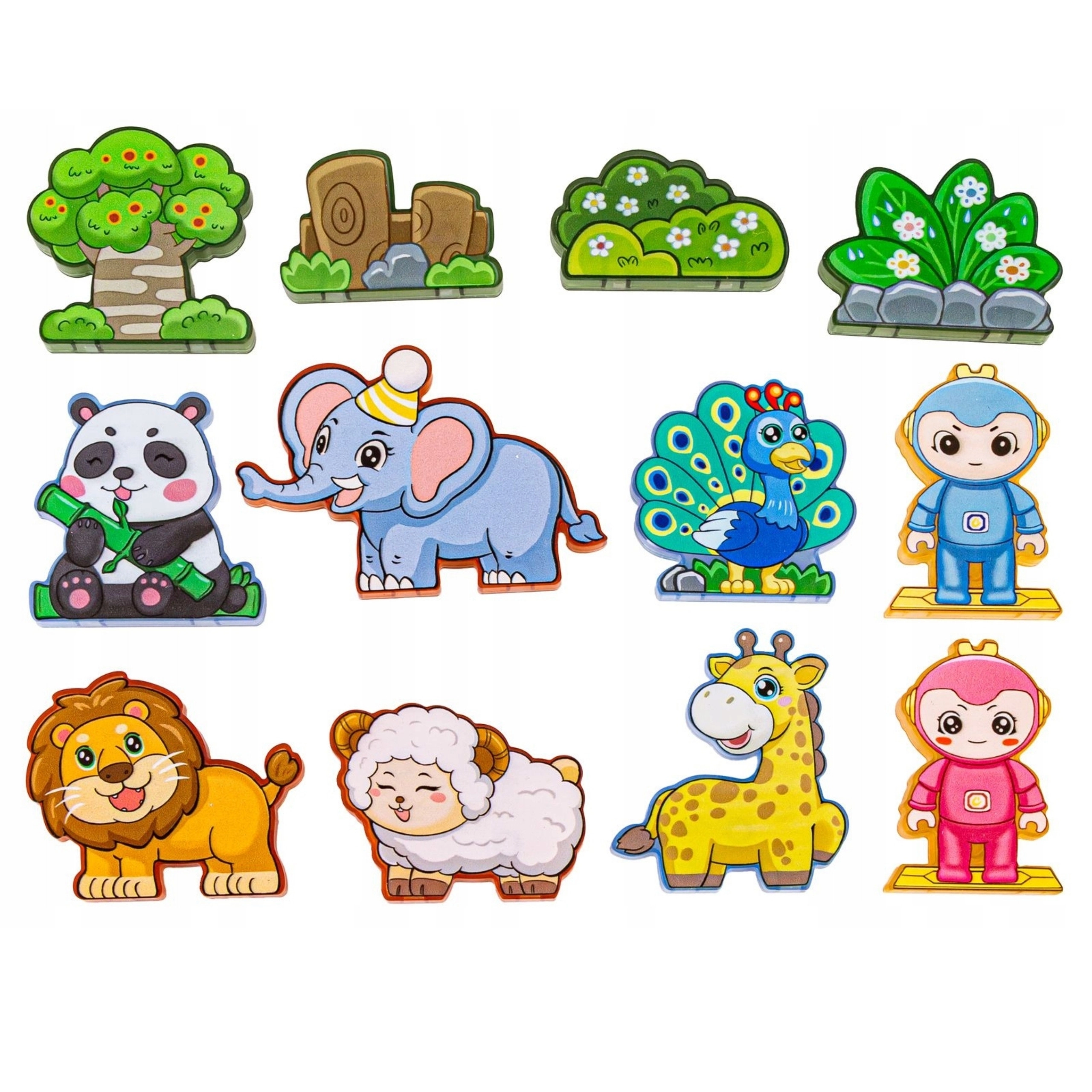 - Daudzveidīgas detaļas: magnētiskas formas, dzīvnieku figūriņas un tēli, tematiski aksesuāri (koks, klintis).