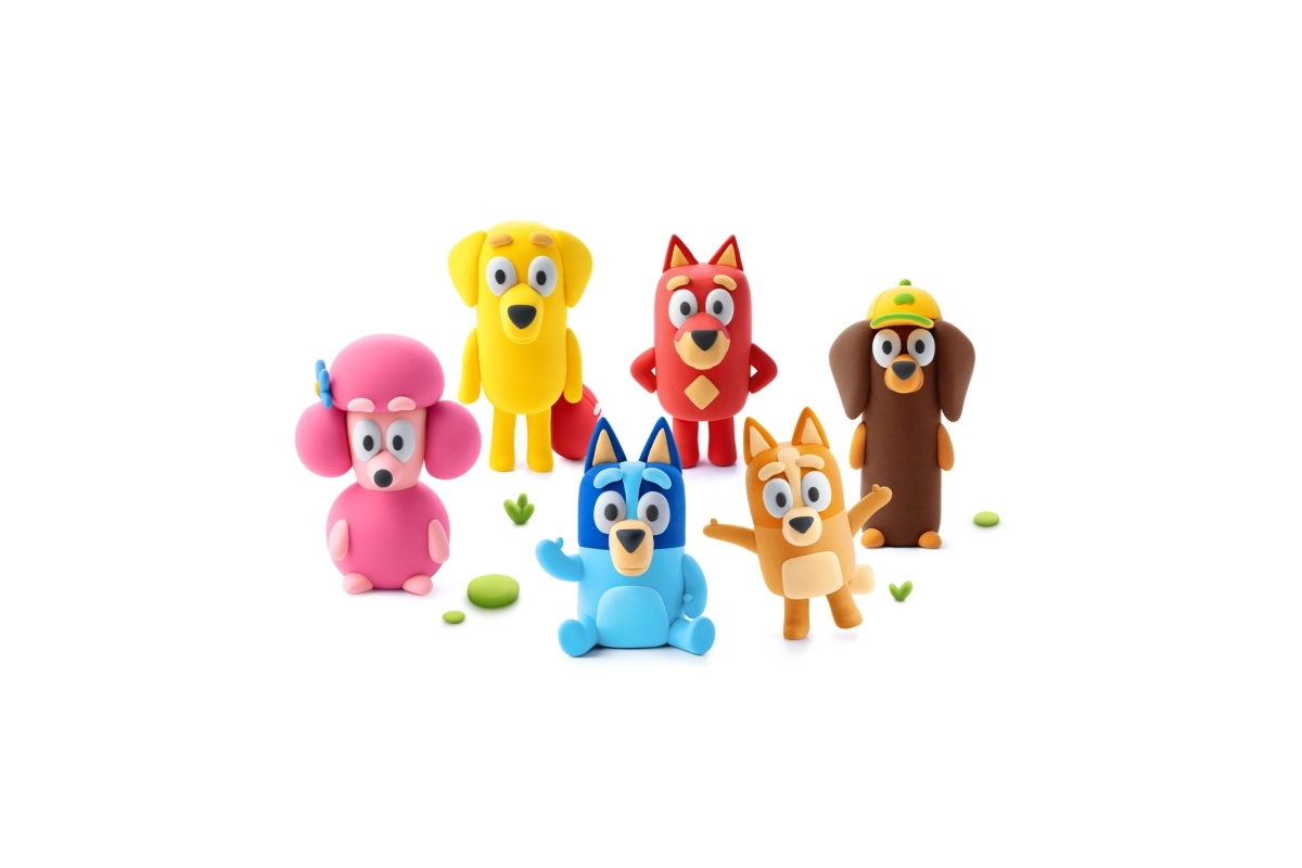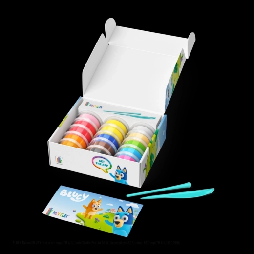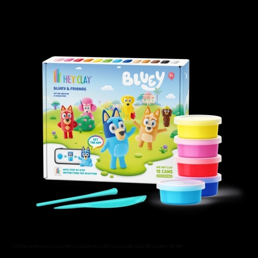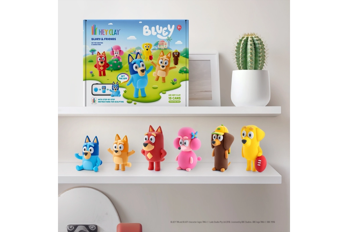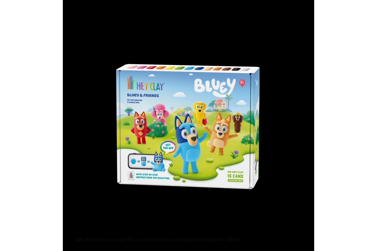 Atklājiet radošo pasauli ar modelēšanas masu HEY CLAY un komplektu Bluey un draugi. Izveidojiet visu sešnieku iemīļoto varoņu – Bluey, Bingo, Lucky, Snickers, Coco un Rusty – izmantojot krāsainu, vieglu masu un interaktīvas instrukcijas lietotnē. Pabeigtās figūriņas pēc nožūšanas kļūst cietas un ir lieliskas gan spēlēšanai, gan kolekcionēšanai.