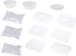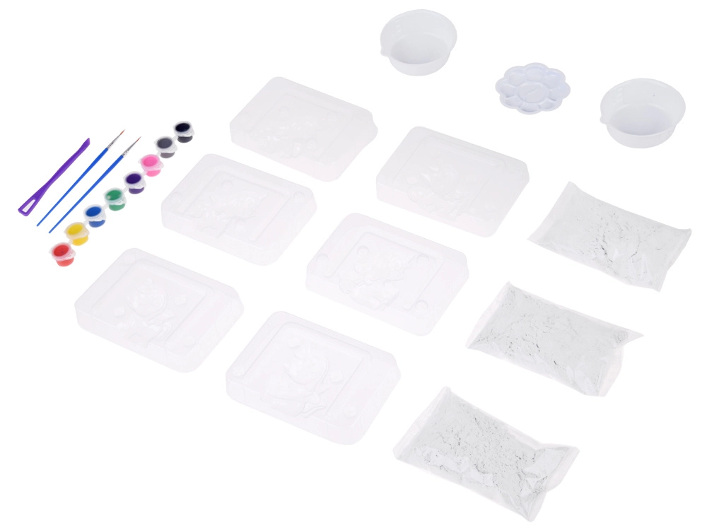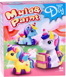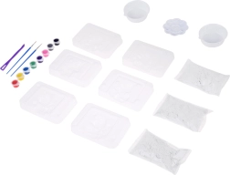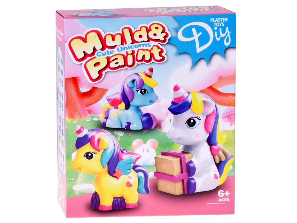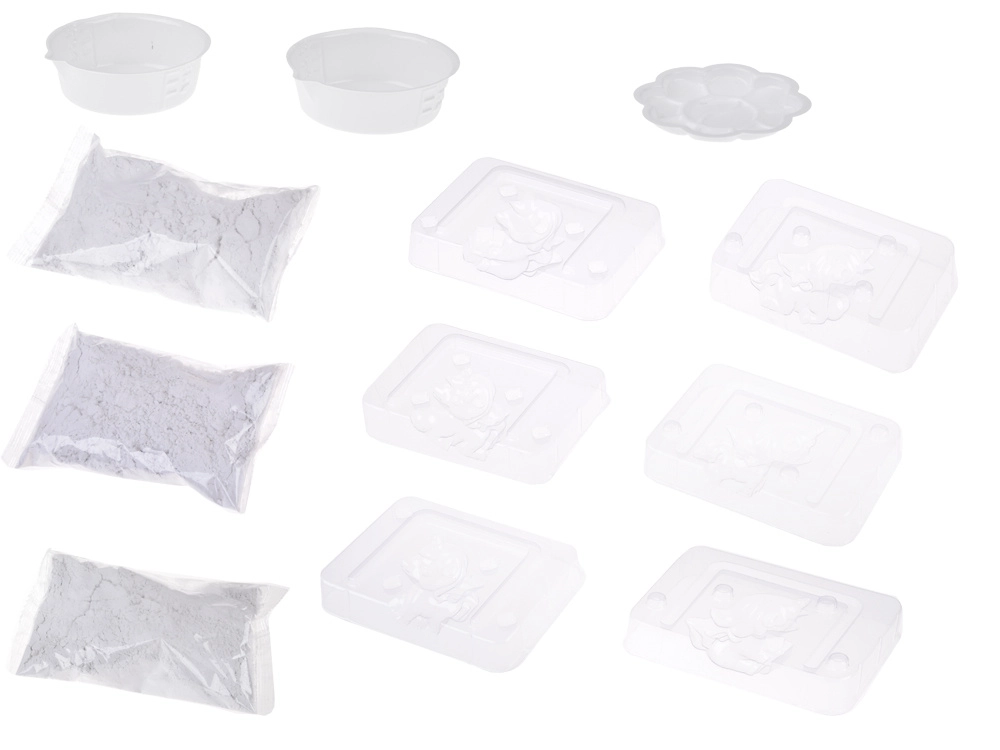 Komplektā ietilpst: 3 ģipša paciņas, 3 vienradžu formas, 2 mērtrauki, 1 palete/bļodiņa krāsu jaukšanai, 8 krāsas, 2 otas, 1 plastmasas nazītis. Padoms: gludai liešanas virsmai maisiet ģipsi līdz pilnīgai izšķīšanai un viegli paklapiniet formu, lai izkļūtu gaisa burbulīši.
