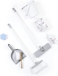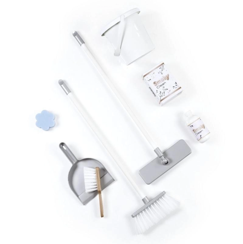 Komplektā ir bagātīgi piederumi: liekšķere un slotiņa, mops, birste, spainis un tīrīšanas līdzekļu maketi. Viss glīti novietojams praktiskajos pārvietojamos ratos ar rokturi un organizētājiem, tādējādi bērni rotaļājoties apgūst kārtību un atbildību.