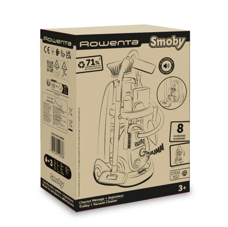 Šie stilīgie tīrīšanas rati ar ROWENTA licenci pārvērš mājas uzkopšanu iemīļotā spēlē. Bērni, izmantojot reālistisku putekļsūcēju ar īstu skaņu, var atdarināt pieaugušos, savukārt ergonomiski veidotie rīki lieliski der bērnu rokās. Vieglā un viegli vadāmā konstrukcija ļauj droši darboties arī mazākiem bērniem.