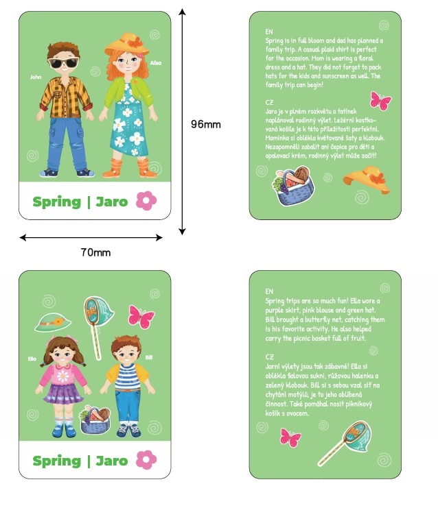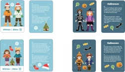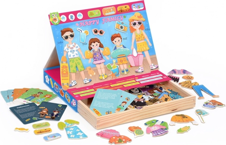 Magnētiskā ģimenes pārģērbšana ir radošs komplekts, kurā bērni veido tērpus mammai, tētim, meitai un dēlam. Pateicoties plašajam apģērbu un aksesuāru klāstam, var radīt tērpus vasarai, rudenim, ziemai un pavasarim, kā arī pildīt jautrus uzdevumus no tematiskajām kartītēm. Praktiska koka magnētiskā kastīte ar rotējamu tāfeli kalpo gan kā spēles laukums, gan uzglabāšanas kaste, tāpēc spēle ir gatava doties līdzi jebkur.