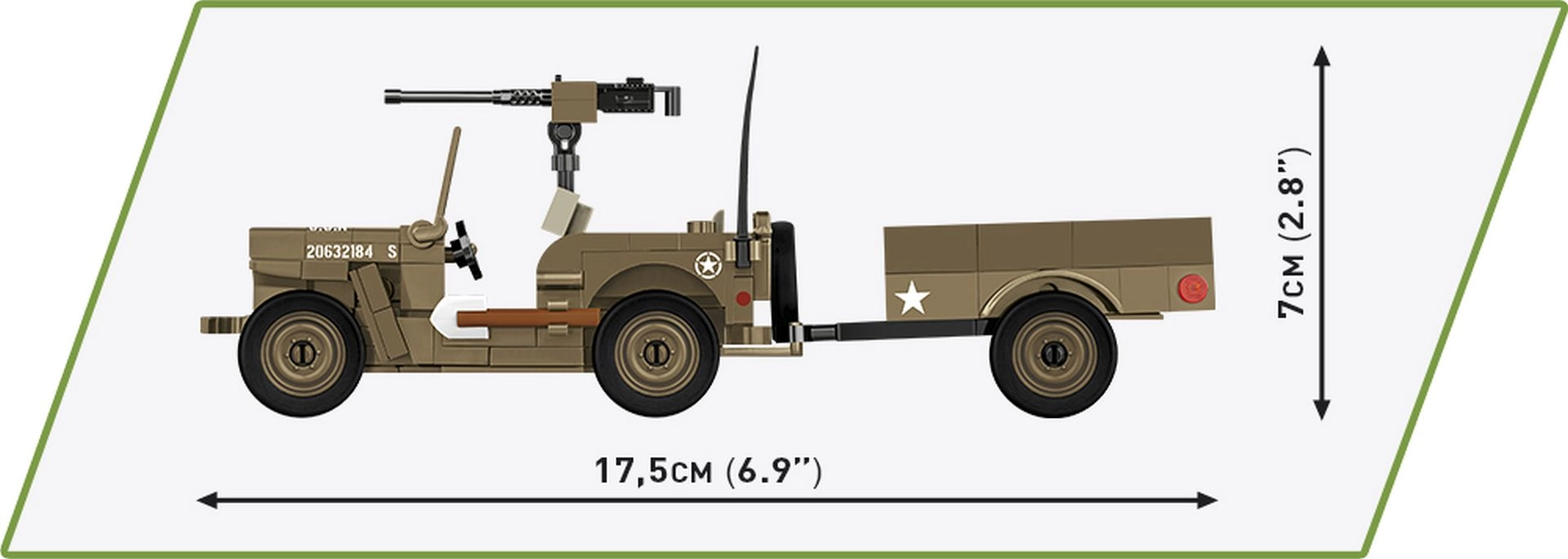 Konstruktors ietver 200 klucīšu un 2 karavīru figūriņas ar piederumiem. Piekabi var viegli pievienot un atvienot, riteņi brīvi ripo, bet ložmetējs griežas – ideāli savu WWII ainu veidošanai. Lieliska dāvana militārās tehnikas entuziastiem un jaunajiem būvētājiem.