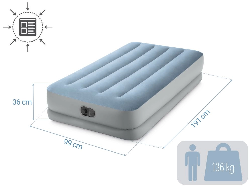 Praktiska un ērta uzpūšamā gulta vienai pieaugušai personai ar izmēriem 191 × 99 × 36 cm. Pateicoties Fiber-Tech un Dura-Beam tehnoloģijām, tā nodrošina stabilu atbalstu, mīkstu velūra virsmu un ilgstošu kalpošanas laiku. Iebūvēta USB elektriskā pumpa parūpēsies par ātru uzpūšanu jebkur – no barošanas bloka, lādētāja vai USB porta. Maksimālā slodze 136 kg, komplektā ir pārvadāšanas soma un remonta ielāps.