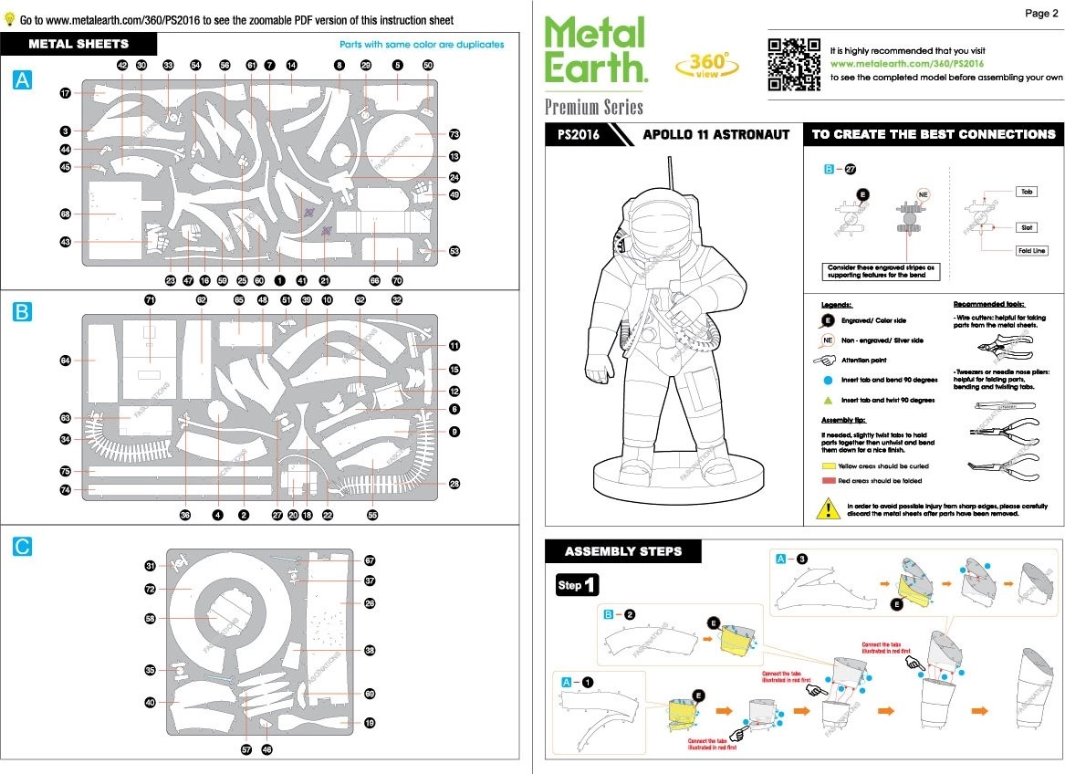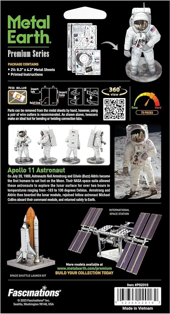 Atklājiet precīzas metāla modelēšanas prieku ar METAL EARTH premium sēriju. No plakanām kvadrātveida tērauda plāksnēm jūs saliksiet reālistisku Apollo 11 astronauta miniatūru ar smalku lāzera gravējumu, kas izceļ katru skafandra detaļu.