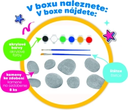 Atklājiet radošu komplektu zīmēšanai uz oļiem, kas bērniem ļauj pārvērst parastus akmentiņus oriģinālos mākslas darbos. Komplektā ir viss nepieciešamais tūlītējai radīšanai – otas, krāsas un oļi, kas attīsta iztēli, sīko motoriku un radošumu. Piemērots bērniem no 4 gadu vecuma.