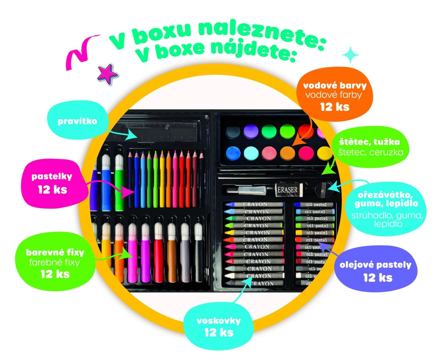 - Viss vienā – krāsainie zīmuļi, flomāsteri, akvareļkrāsas un cits aprīkojums zīmēšanai un gleznošanai.