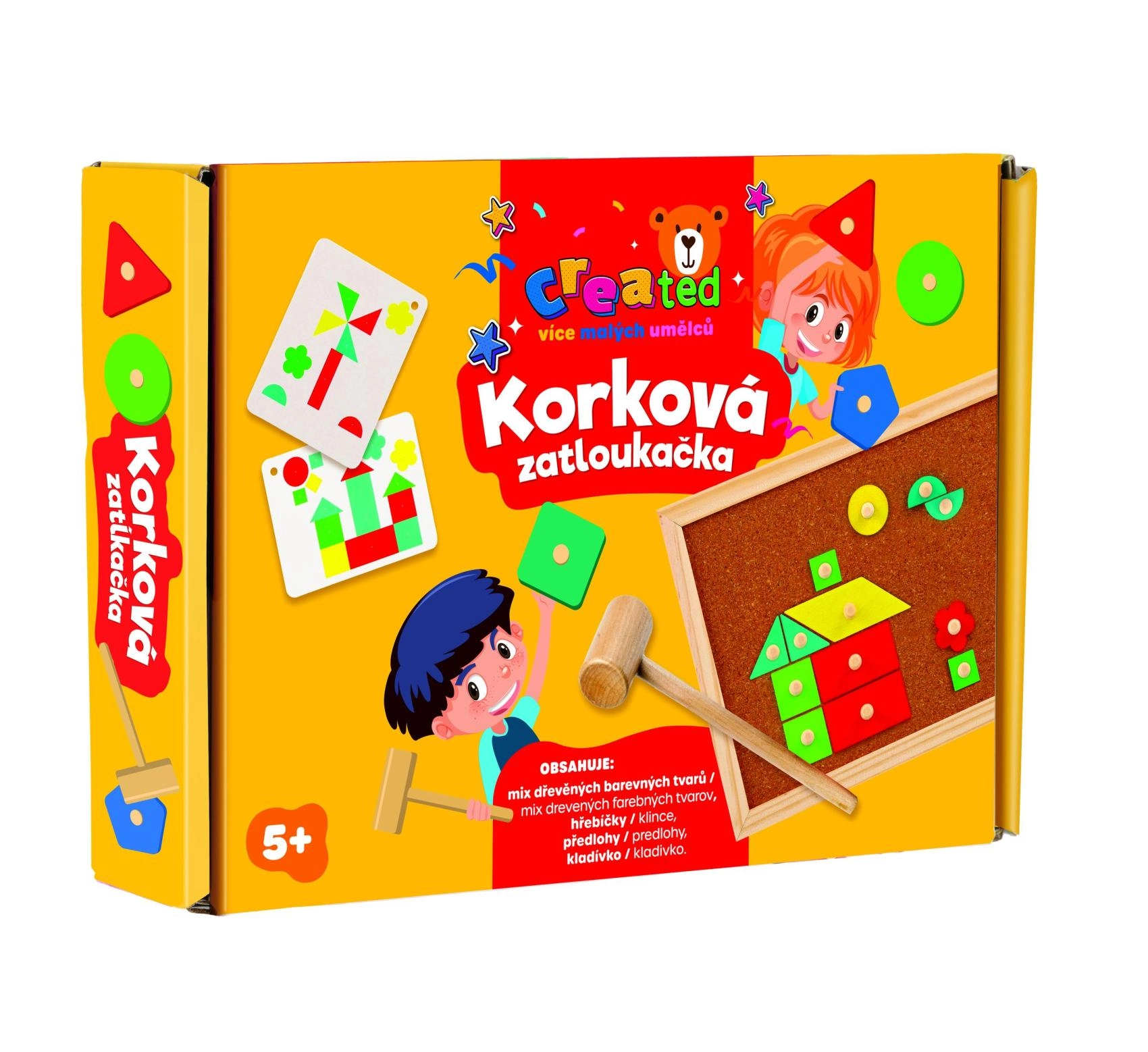 Šis radošais komplekts ir ideāli piemērots pirmajiem būvēšanas projektiem un radošām aktivitātēm. Bērni ar āmuriņa un nagu palīdzību piestiprina krāsainas koka formas pie korķa pamatnes un veido oriģinālus attēlus. Rotaļlieta veicina smalkās motorikas attīstību, acu–roku koordināciju, loģisko domāšanu un radošumu.