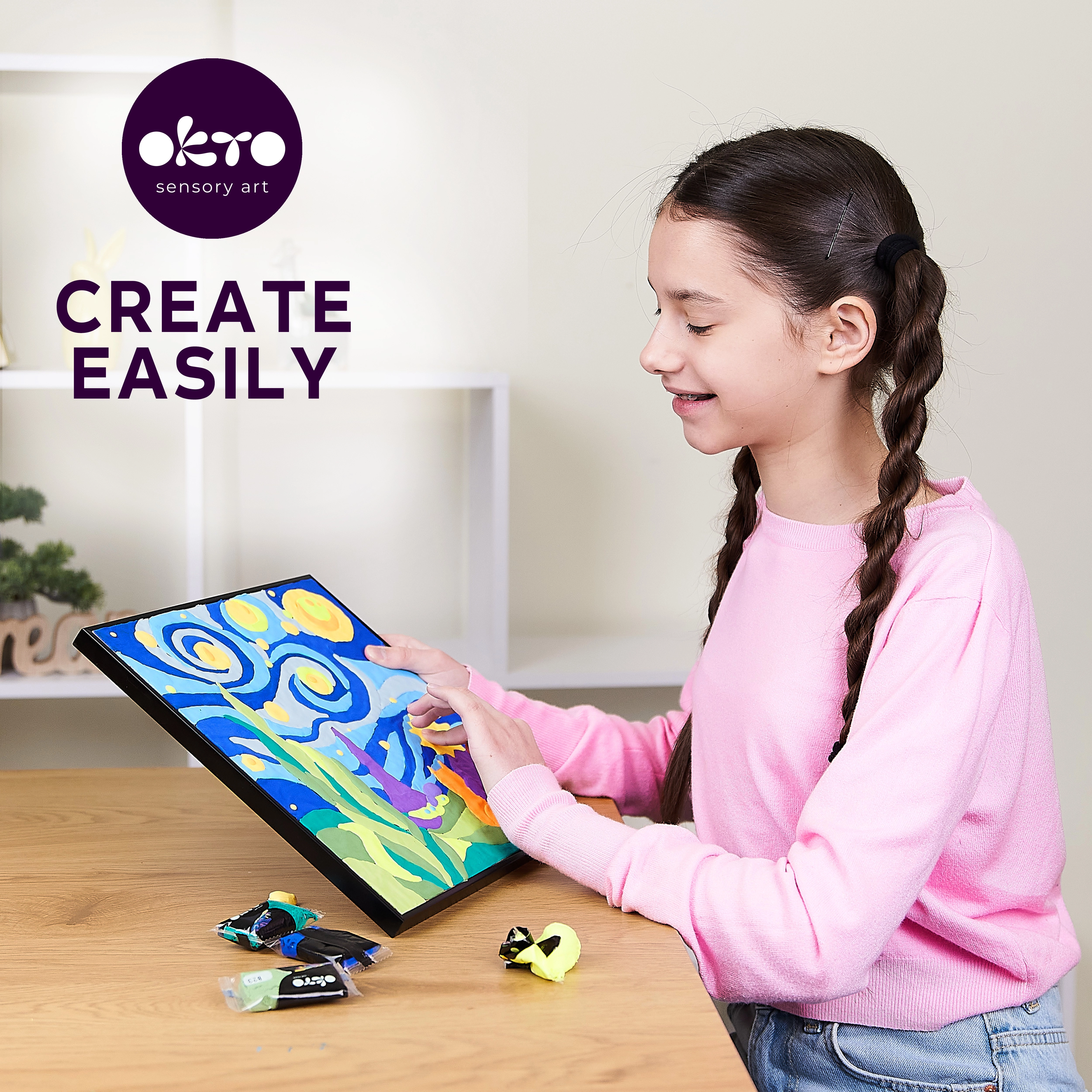 Komplektā atradīsiet visu nepieciešamo – 29 × 29 cm audeklu, attēlu instrukciju, modelēšanas rīku un komplektu ar 14 krāsainām veidojamās masas maisījuma paciņām. Vienkārši sekojiet cipariem, izveidojiet un uzklājiet masu norādītajās vietās. Gatavā glezna lieliski der kā dekors bērnu istabai vai kā oriģināla dāvana.