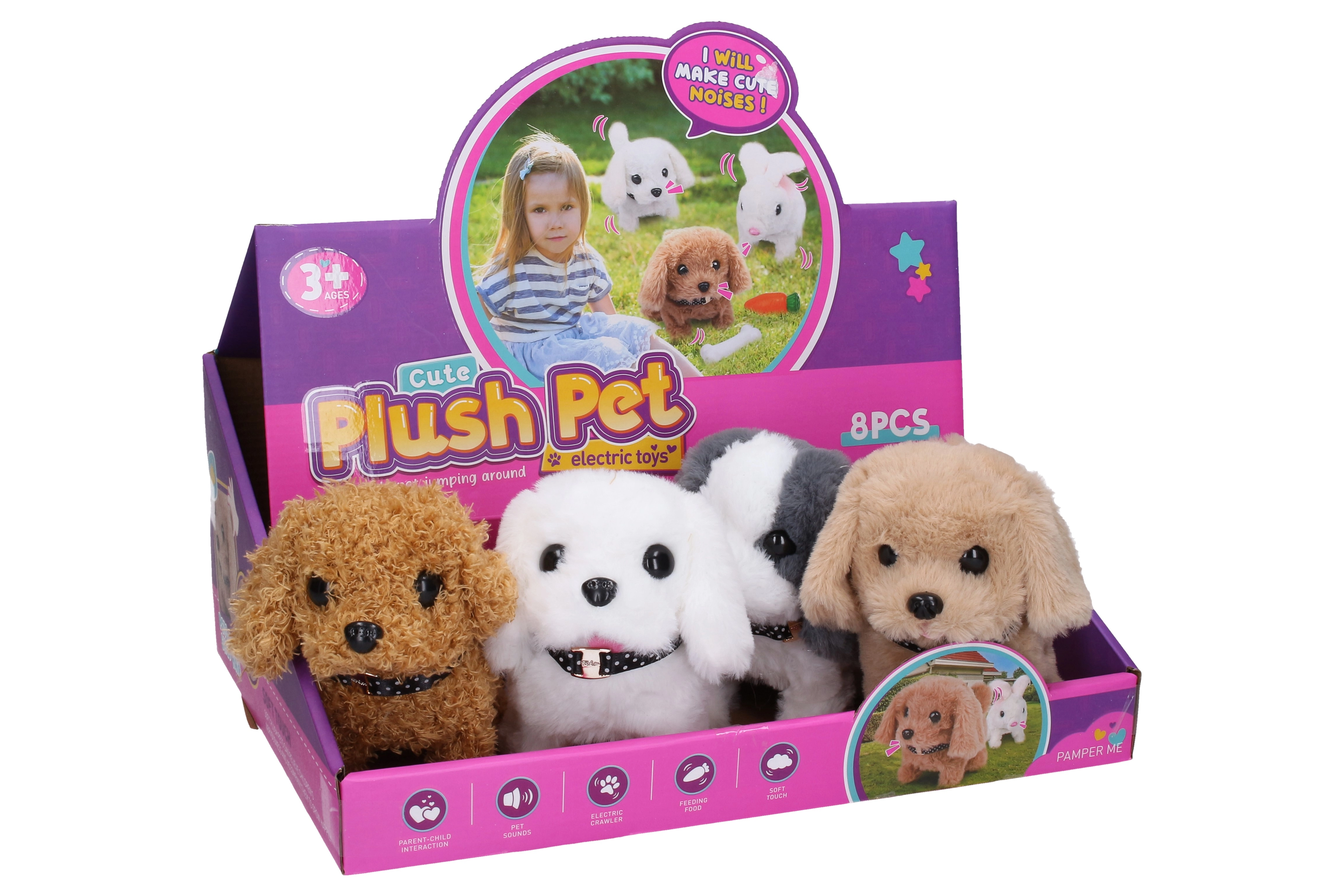 Mīļš staigājošs plīša sunītis 16 cm izmērā sniedz bērniem daudz prieka. Pēc ieslēgšanas staigā, kustina asti un rei. Pieejamas 3 krāsu versijas (balta, brūna, dzeltena). Vienkārša lietošana, pateicoties ON/OFF slēdzim apakšpusē. Darbojas ar 2× AA baterijām (nav iekļautas).