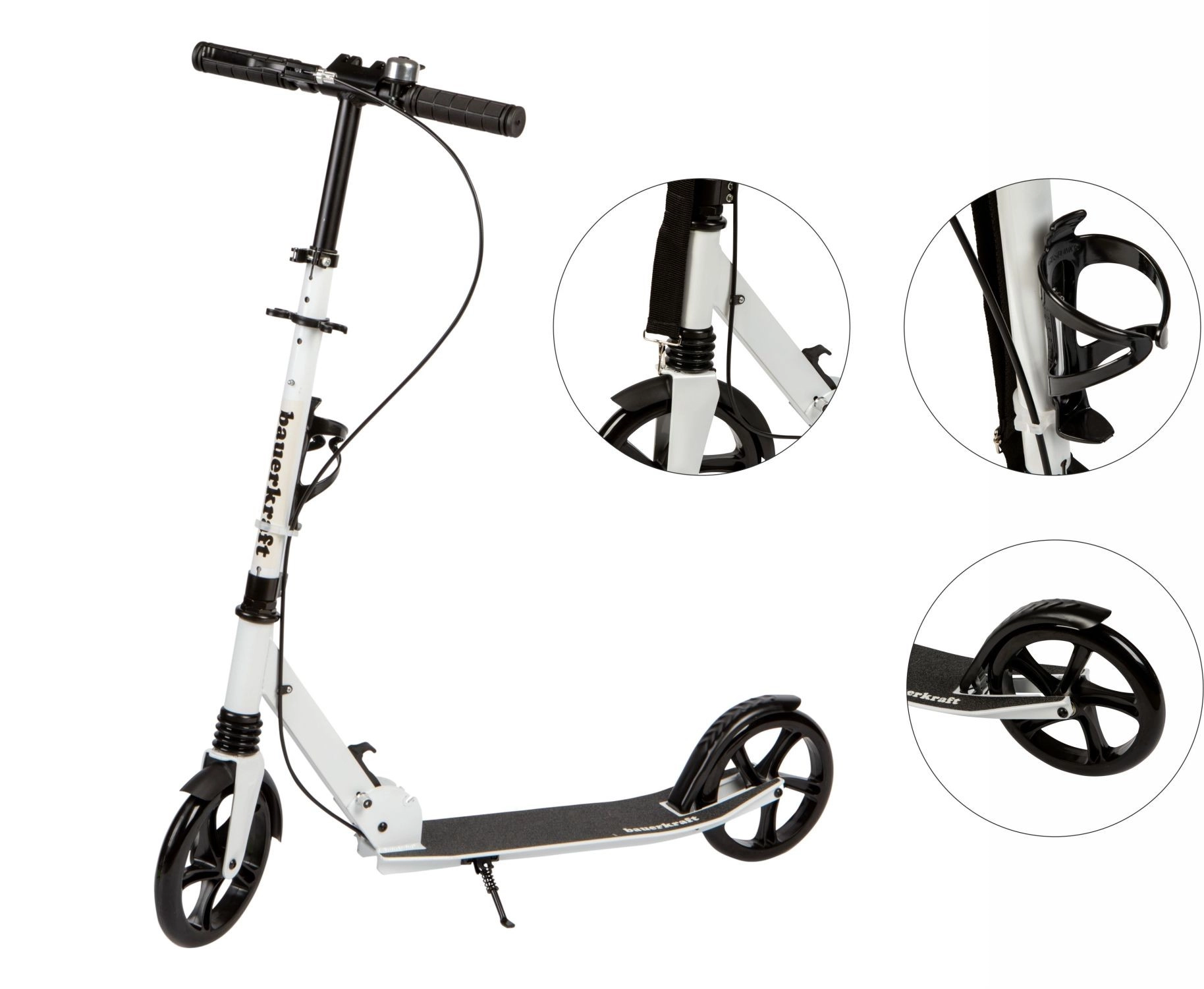 Drošību pastiprina priekšējā rokas bremze un aizmugurējā kājas bremze, kas vienlaikus kalpo kā dubļusargs. Ātra salikšanas mehānisma fiksatori ļauj skrejriteni īsā laikā salocīt līdz kompaktam izmēram, tāpēc to ir viegli pārnēsāt un glabāt. Praktiskais pudeļu turētājs nodrošina dzērienu vienmēr pa rokai, bet integrētais kājbalsts ļauj ērti novietot stāvēšanai.