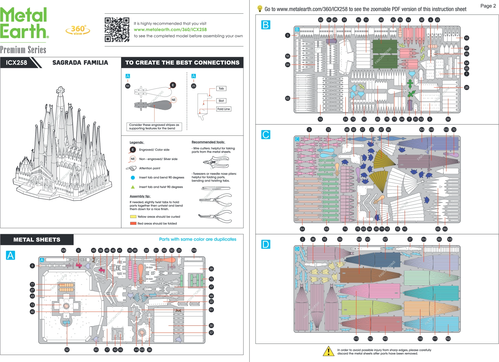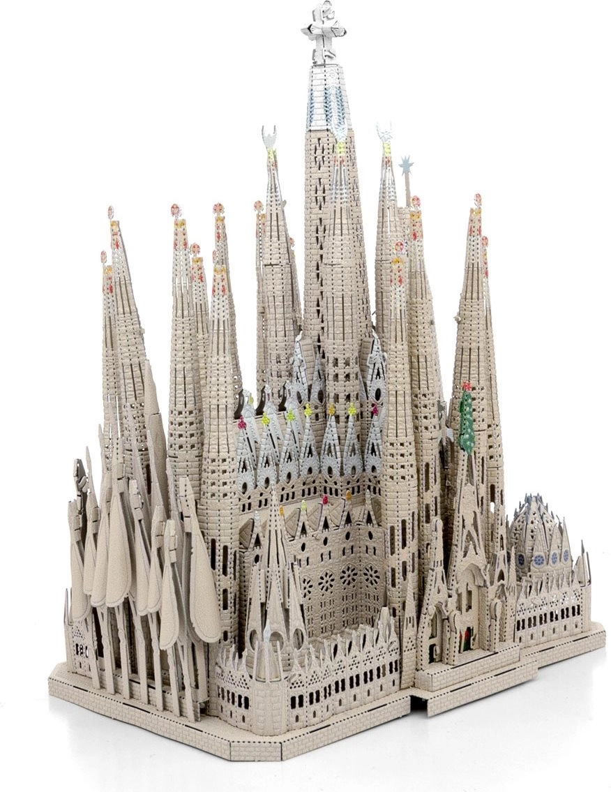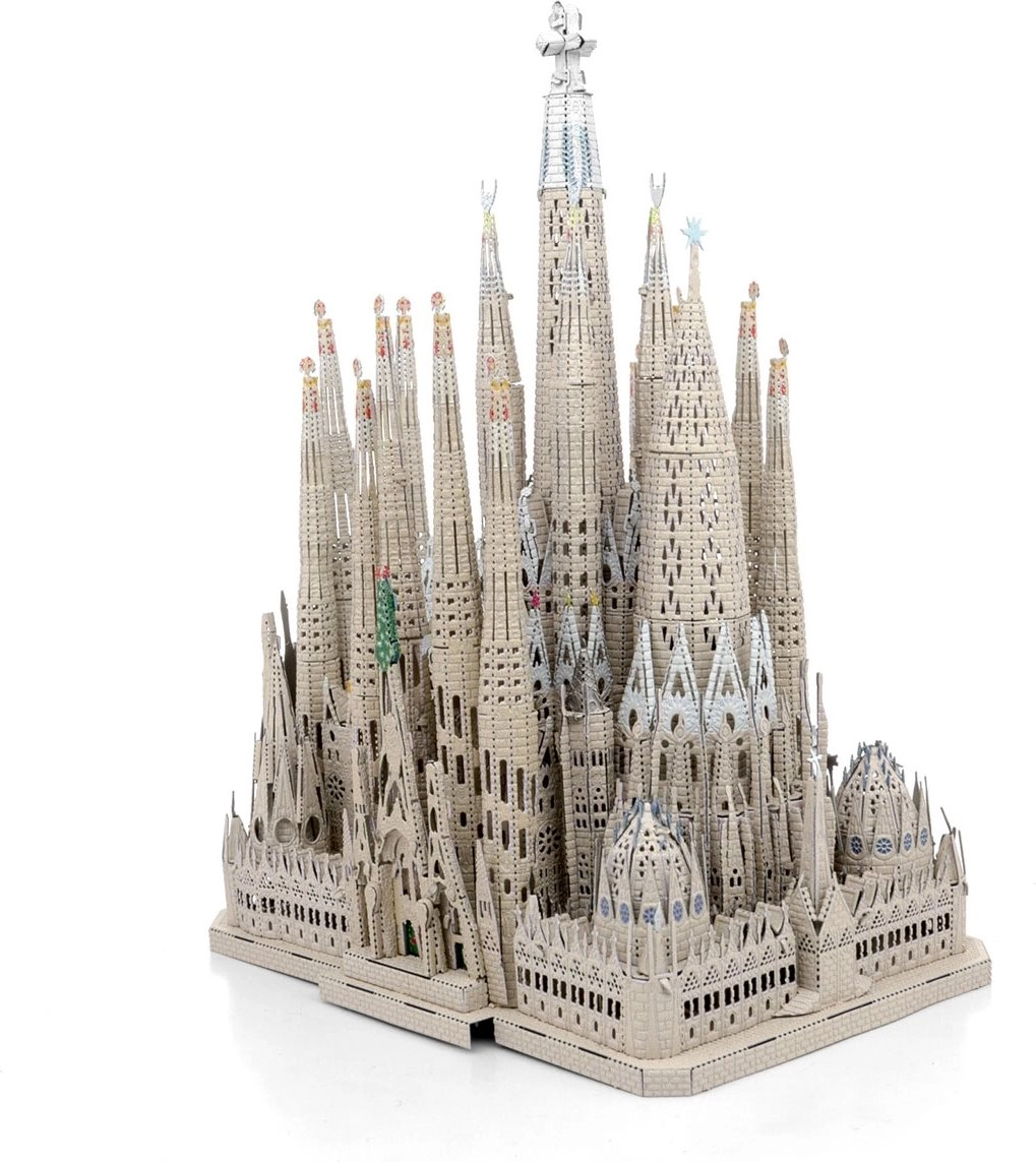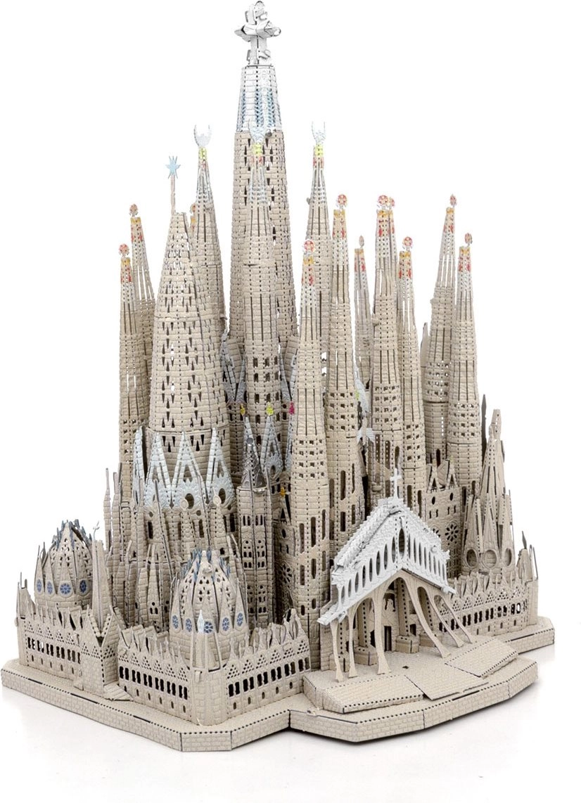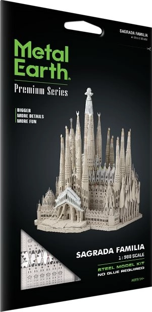 METAL EARTH premium komplekts ļauj no plakanām tērauda loksnēm izveidot iespaidīgu Sagrada Família 3D modeli. Atsevišķās detaļas izspiež no metāla planšetēm un savieno ar fiksatoriem – bez līmes. Lāzergravētās detaļas izceļ fasādes, torņus un logus, piešķirot modelim autentisku izskatu.