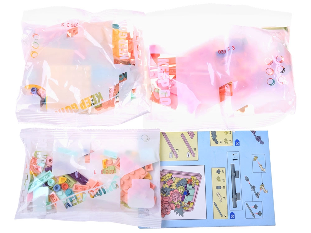 - Konstruktora detaļas, rāmītis/stends atkarībā no motīva, kārtošanas maisiņi, ilustrēta instrukcija