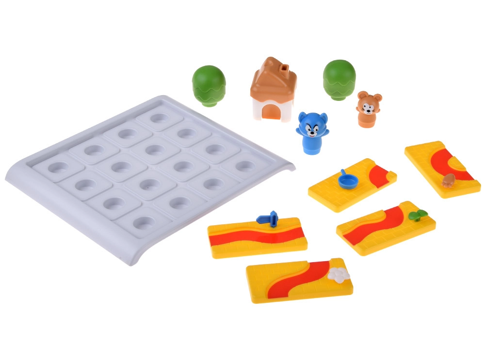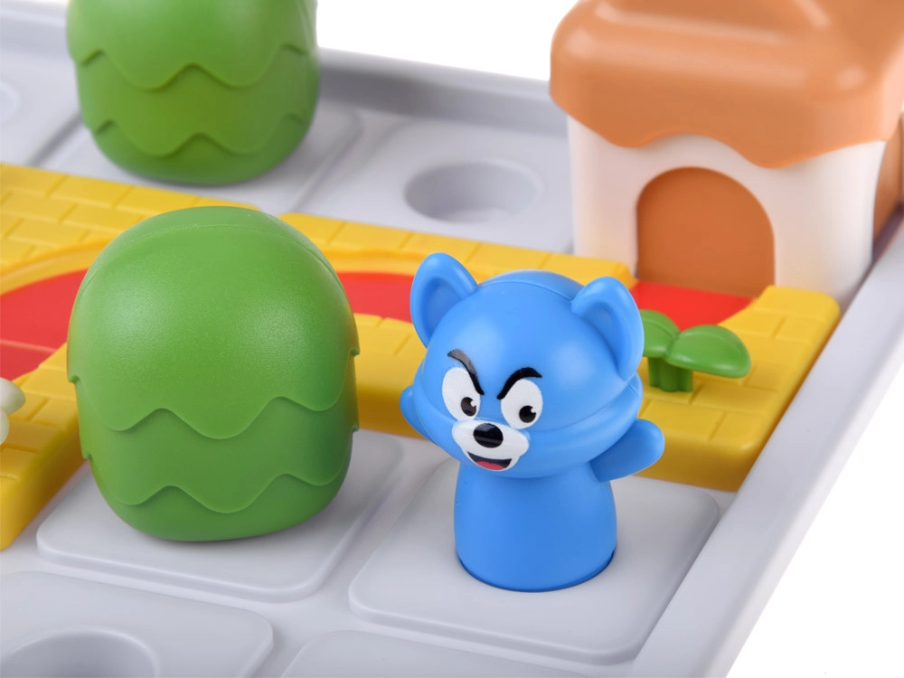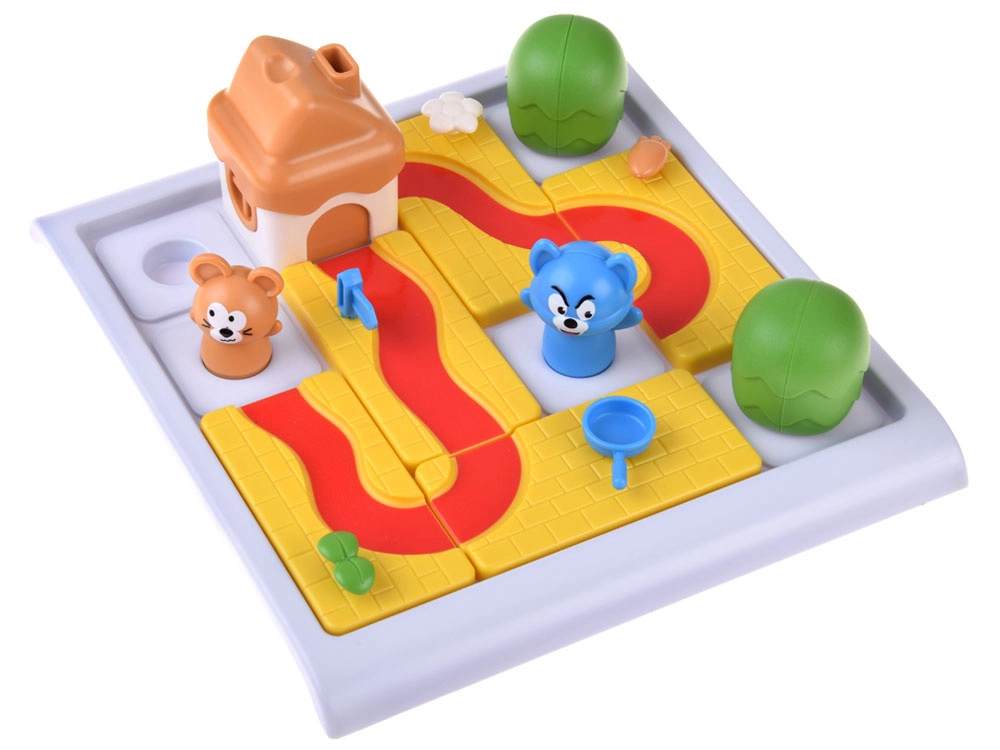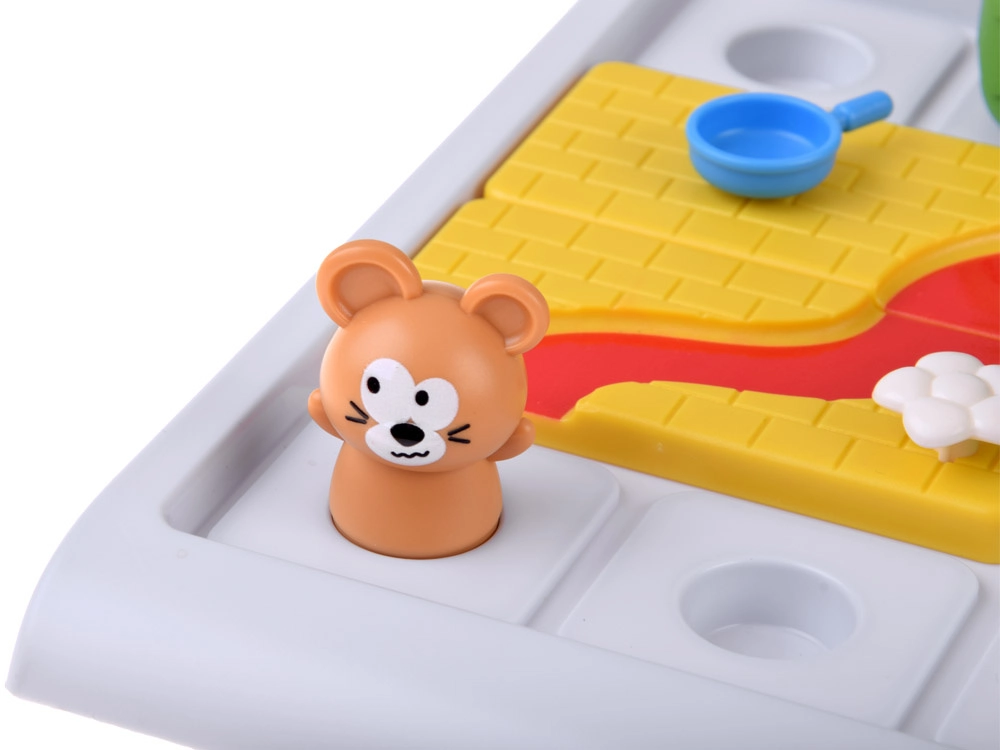 Izturīgas plastmasas komponentes ar noapaļotām malām — taciņu gabali, mājiņa ar sieru, koki un peļas un kaķa figūriņas — veicina sīko motoriku un vieglu satveršanu.