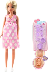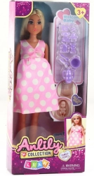 Šī ANLILY lelle grūtniecības laikā ir lieliska rotaļlieta radošai lomu spēlei un rūpēm par mazuli. Tai ir pagriežams vēderiņš ar izņemamu mazuli, viņa ir tērpta rozā kleitā ar baltiem punktiem, un komplektā iekļauti praktiski piederumi, piemēram, knupītis, grabulīši, pudelīte, šķīvītis un galda piederumi. Kvalitatīvs izpildījums nodrošina ilgstošu lietošanu un drošu izklaidi.