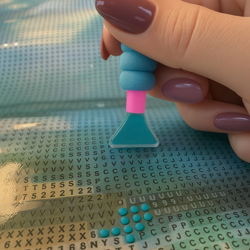 Rievotā paplāte, aplikators un vasks nodrošina precīzu akmentiņu paņemšanu un novietošanu pareizajās vietās atbilstoši simboliem uz audekla.