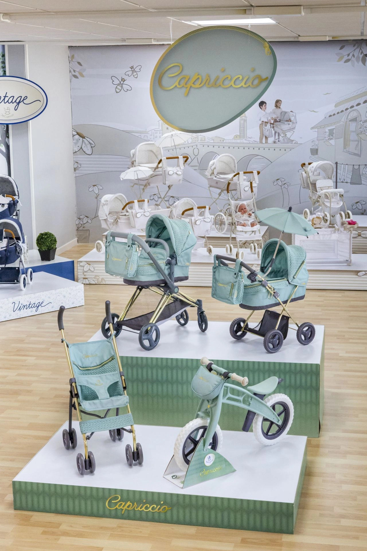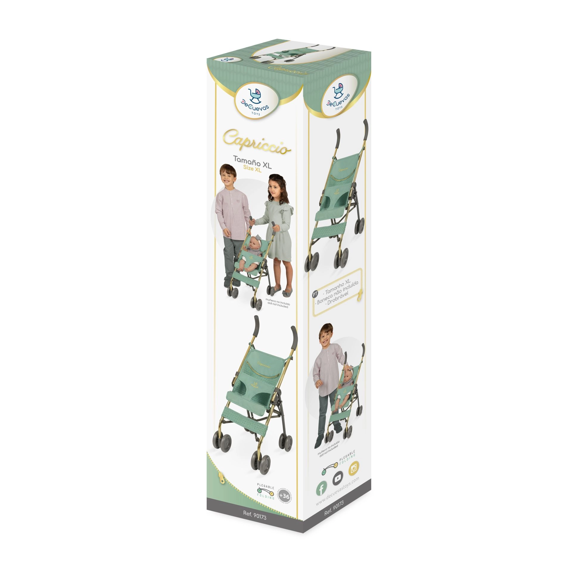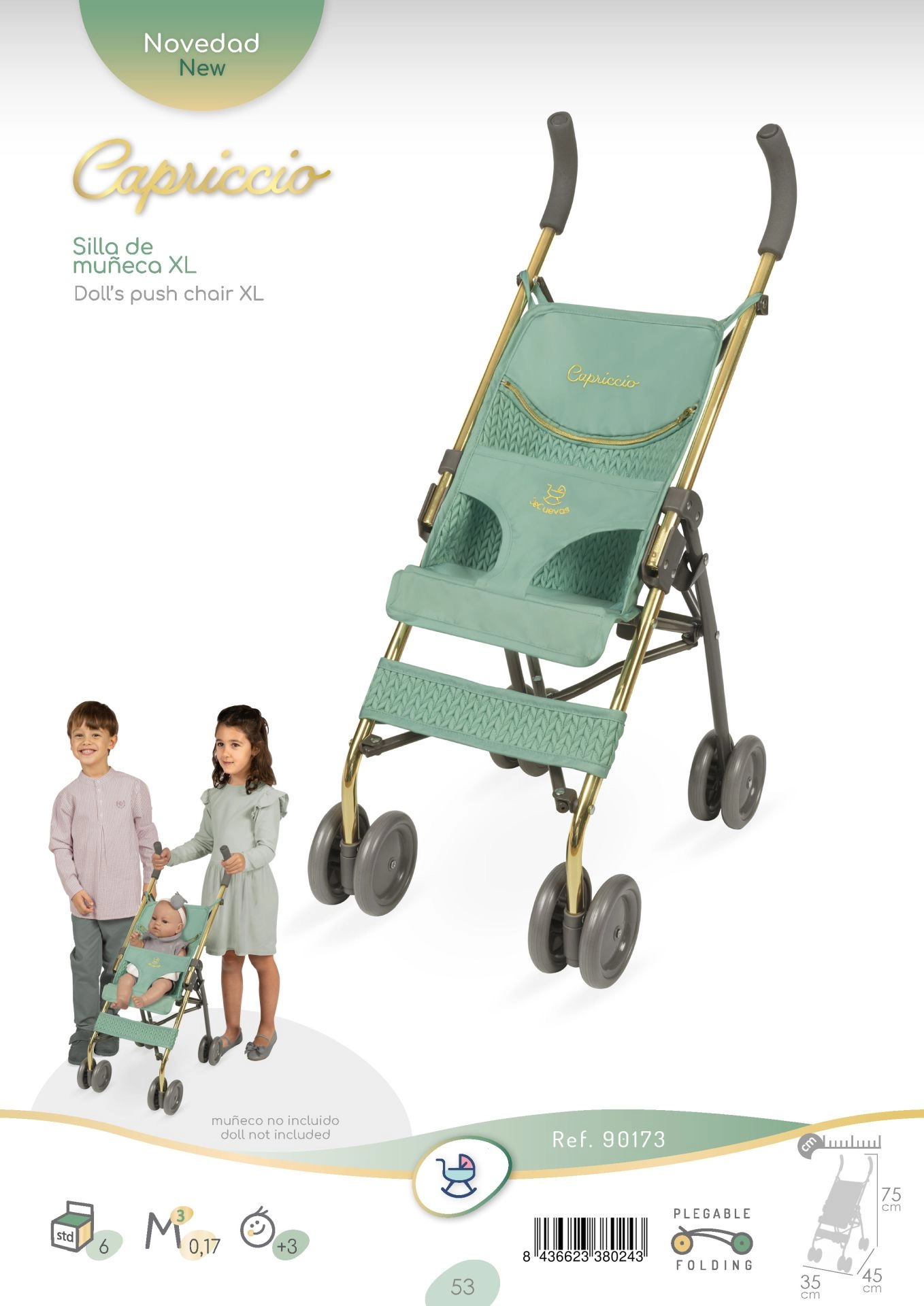 Eleganti golfa tipa leļļu ratiņi ar izsmalcinātu tekstila apdari, apvienojot trikotāžas imitāciju un gludu audumu. Tumši pelēkais rāmis ar zeltainām detaļām un izšuvumu CAPRICCIO izceļ premium klases izskatu. Roktura augstums 75 cm lieliski piemērots pirmsskolas vecuma bērniem.