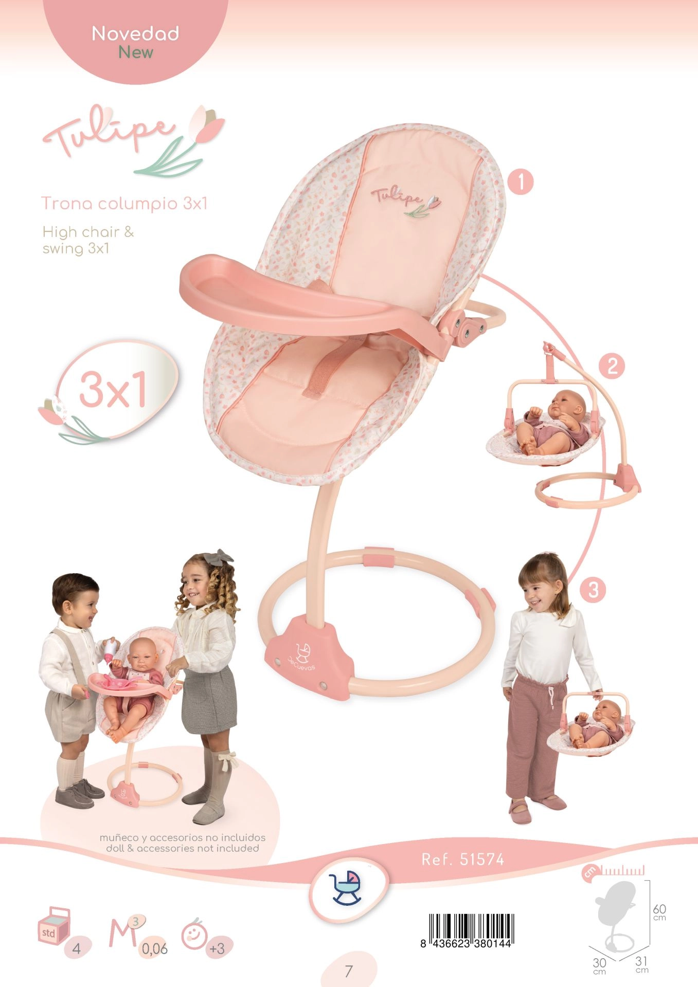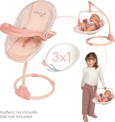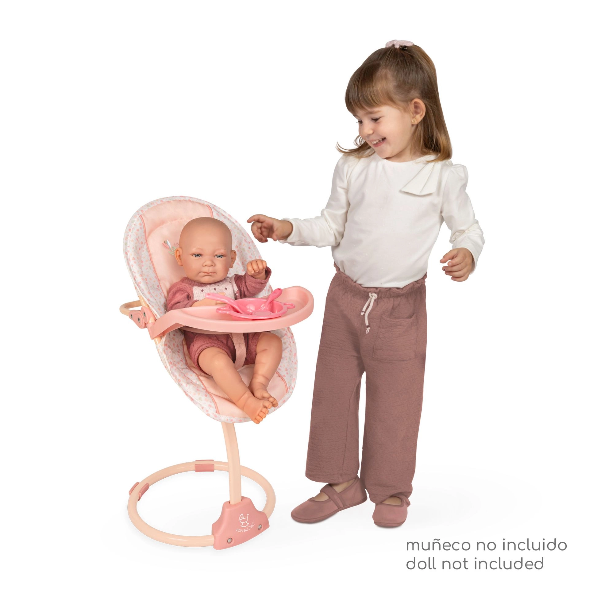 - Krēsliņš/šūpoles, noņemams sēdeklis, galdiņš (lelle un aksesuāri nav iekļauti)