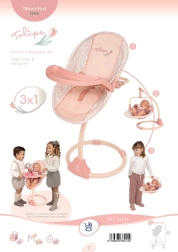 Stilīgs bērnu krēsliņš un šūpoles 3 vienā no kolekcijas Tulipe iepriecinās ar maigu dizainu un gudru funkcionalitāti. Pateicoties noņemamam, abpusējam sēdeklim, to var izmantot kā ēdamkrēsliņu, šūpoles un arī nēsājamo ieliktni. Neiztrūkst drošības siksnas, plastmasas barošanas galdiņš un viegla, bet stabila konstrukcija ērtai lietošanai. Ideāli lellēm līdz 50 cm un bērniem no 3 gadu vecuma.