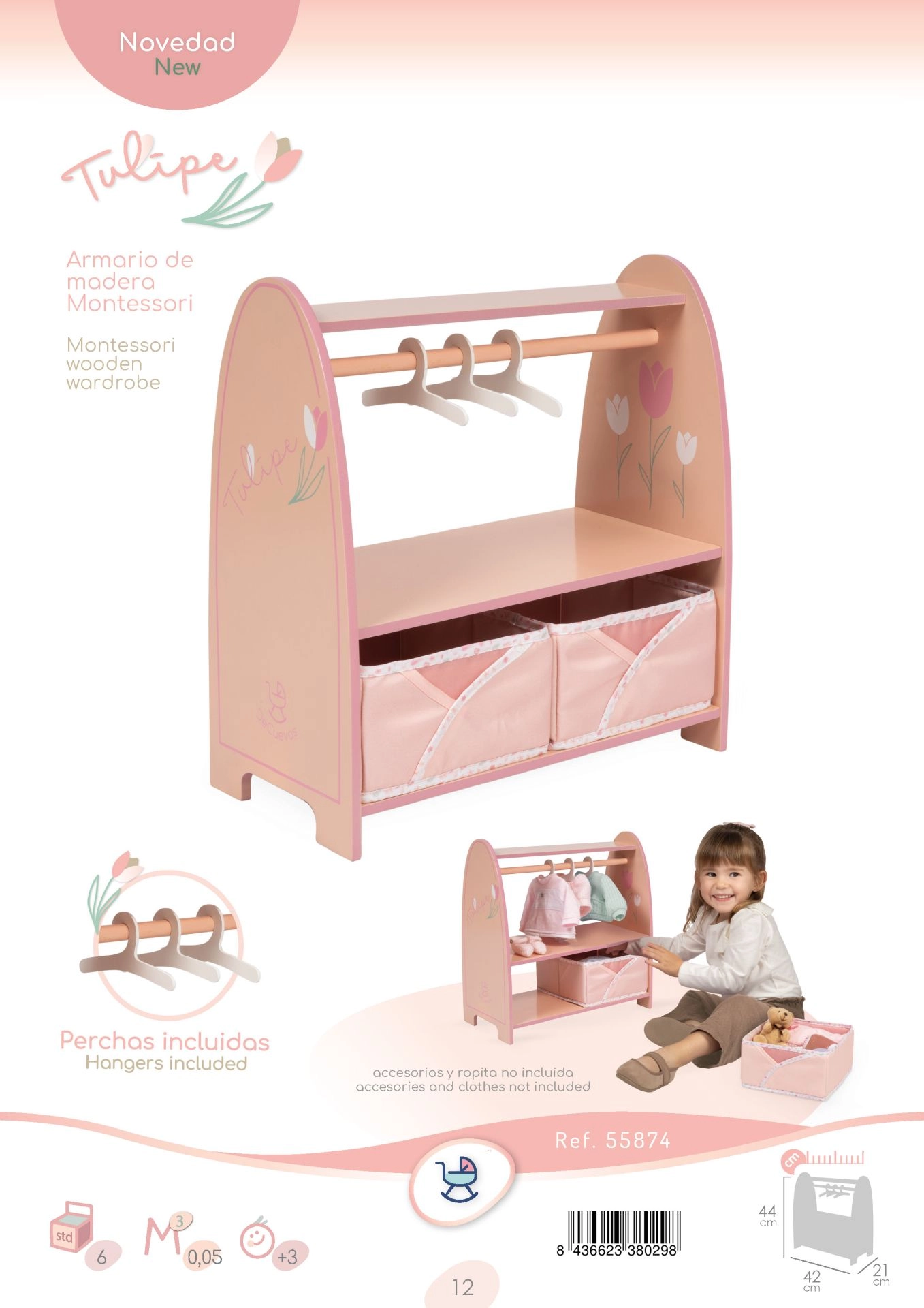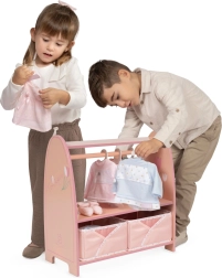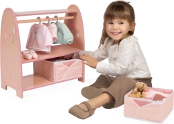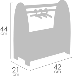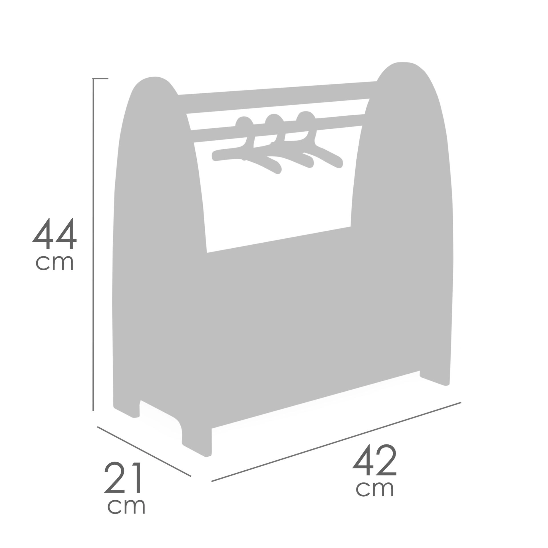 Palīdziet bērniem uzturēt kārtību leļļu pasaulē. Šis kompaktā izmēra koka drēbju pakaramais no TULIPE kolekcijas piedāvā praktisku risinājumu apģērbu un aksesuāru karināšanai un glabāšanai. Skapja stienis ar 3 koka pakaramajiem ir piemērots apģērbiem līdz aptuveni 19 cm garumam, apakšējais plaukts un 2 salokāmi auduma groziņi paturēs visu pārējo ērti pa rokai.