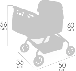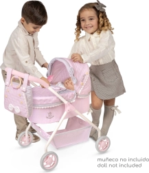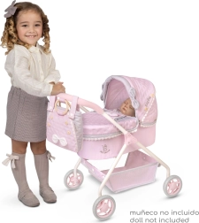 Praktiskajā komplektācijā ietilpst noņemama soma ratiem vai nēsāšanai rokā, vanniņas pārsegs ar cilpām un kabatiņām, ērts matracis un apakšējā uzglabāšanas vieta sīkiem priekšmetiem. Spāņu dizains un precīza izgatavošana nodrošina ilgmūžību un prieku spēlēs ik dienu.