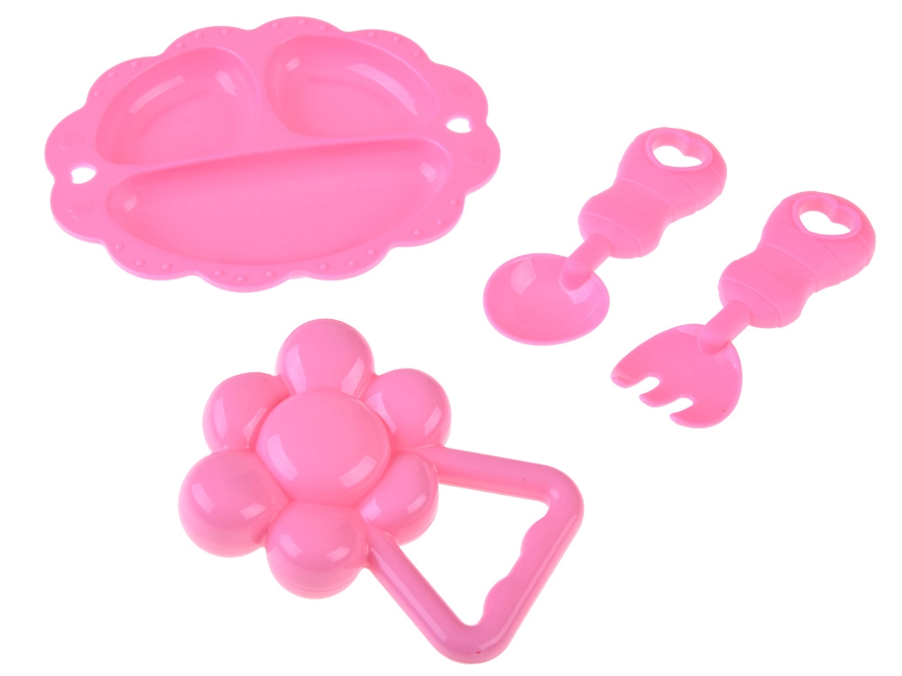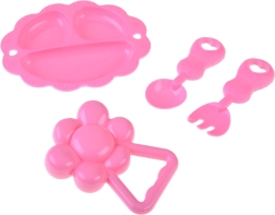 Rozā šķīvītis, karotīte, dakšiņa un grabulītis veicina lomu spēles un attīsta iztēli un motoriku.