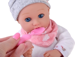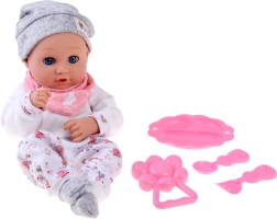 Komplektā ir praktisks barošanas komplekts rozā krāsā – šķīvītis, karotīte un dakšiņa –, kā arī grabulītis. Bērni var pilnvērtīgi izbaudīt lomu spēles, attīstīt iztēli, sīko motoriku un sociālās prasmes.