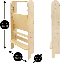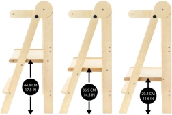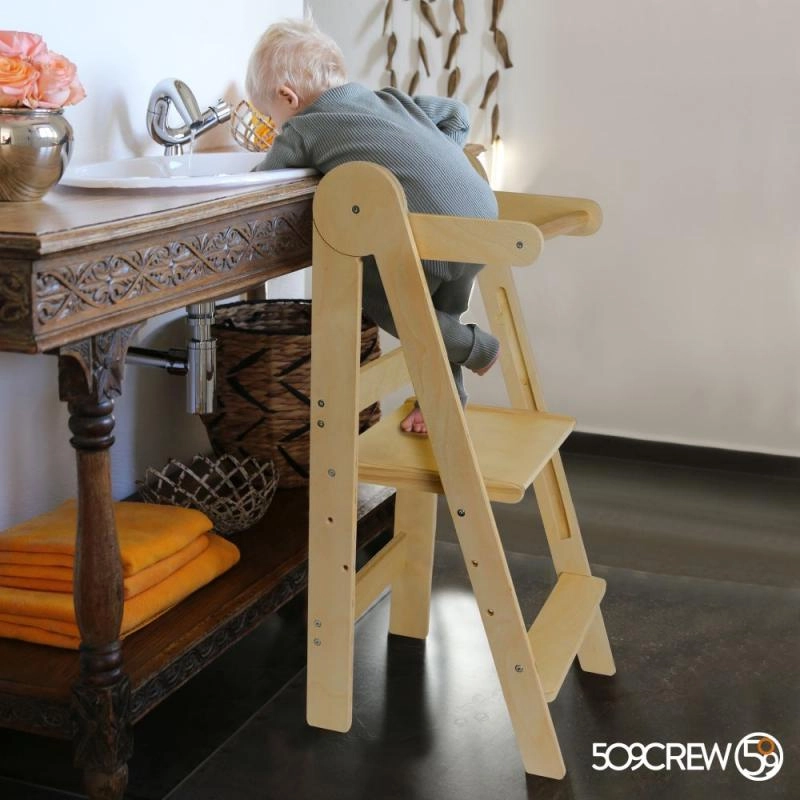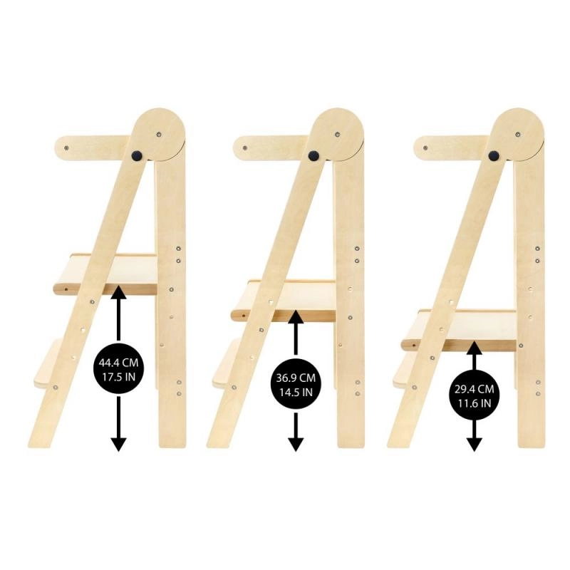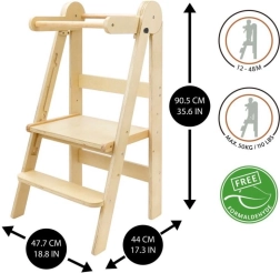 Pārdomātais dizains bērniem ļauj droši un patstāvīgi uzkāpt ar pakāpienu 16 cm augstumā. Tornis ir saliekams, to viegli pārvietot no virtuves uz vannasistabu, un glabājot tas aizņem minimumu vietas. Testētā koksne nesatur formaldehīdu, tāpēc varat būt droši par materiāla nekaitīgumu veselībai.