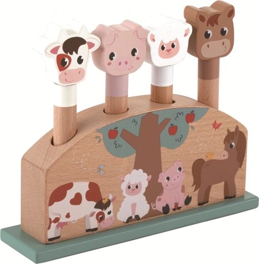 Šī koka pop-up rotaļlieta sniedz daudz smieklu un pārsteigumu – gotiņa, sivēntiņš, aitiņa un kumeļš, nospiežot atsperi, jautri izlec. Pateicoties kvalitatīvam dabīgam kokam un zemes toņiem, rotaļlieta lieliski iederas jebkurā bērnistabā.