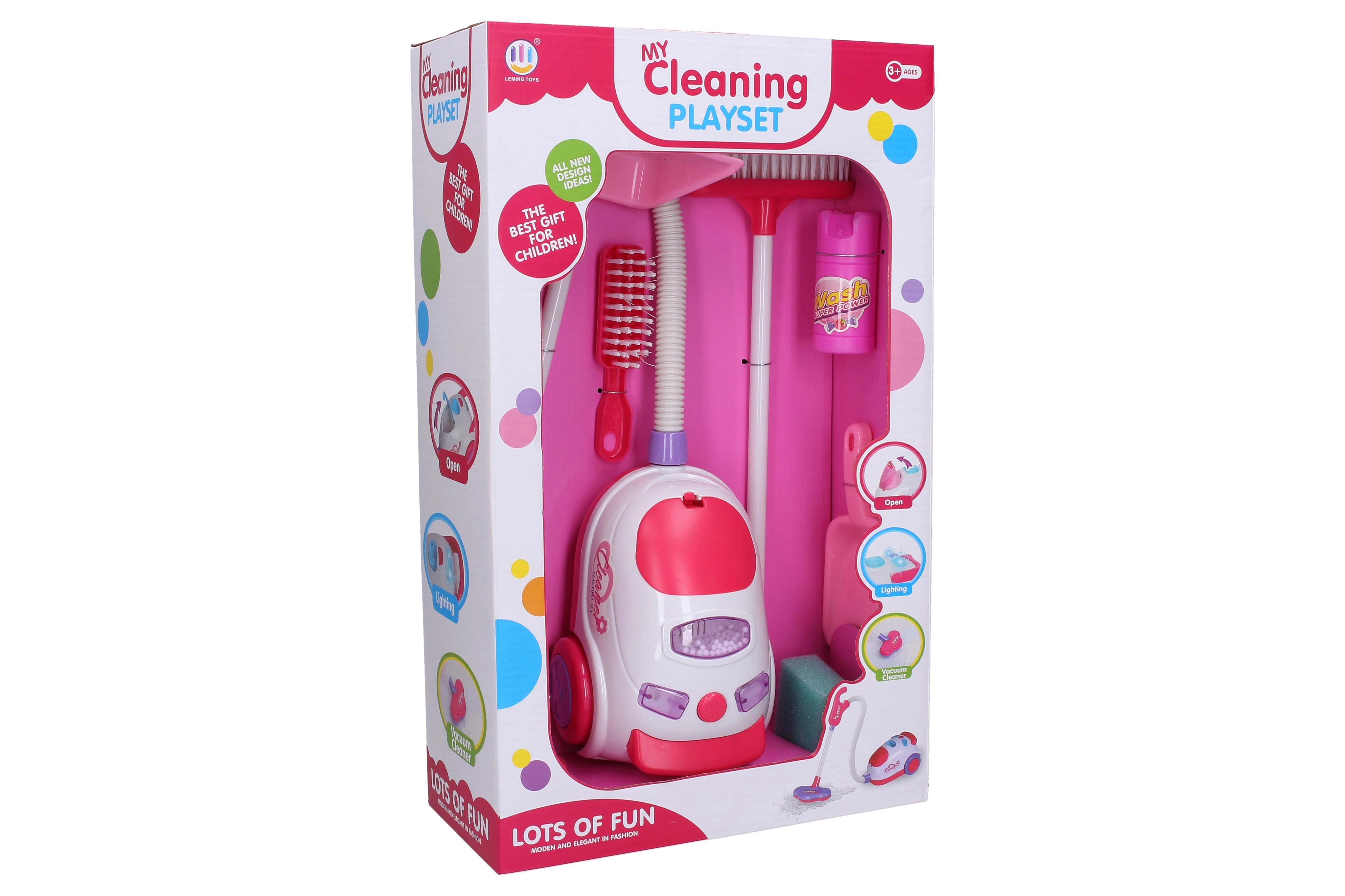 Izklaidējošs tīrīšanas komplekts bērniem ar funkcionējošu putekļsūcēju polistirola bumbiņām un gaismas efektiem. Komplektā ir 9 praktiski piederumi reālistiskai mājas spēlei. Funkcionāla sūkšana, gaismas efekti un bagātīgs piederumu klāsts rosina iztēli un attīsta sīko motoriku.