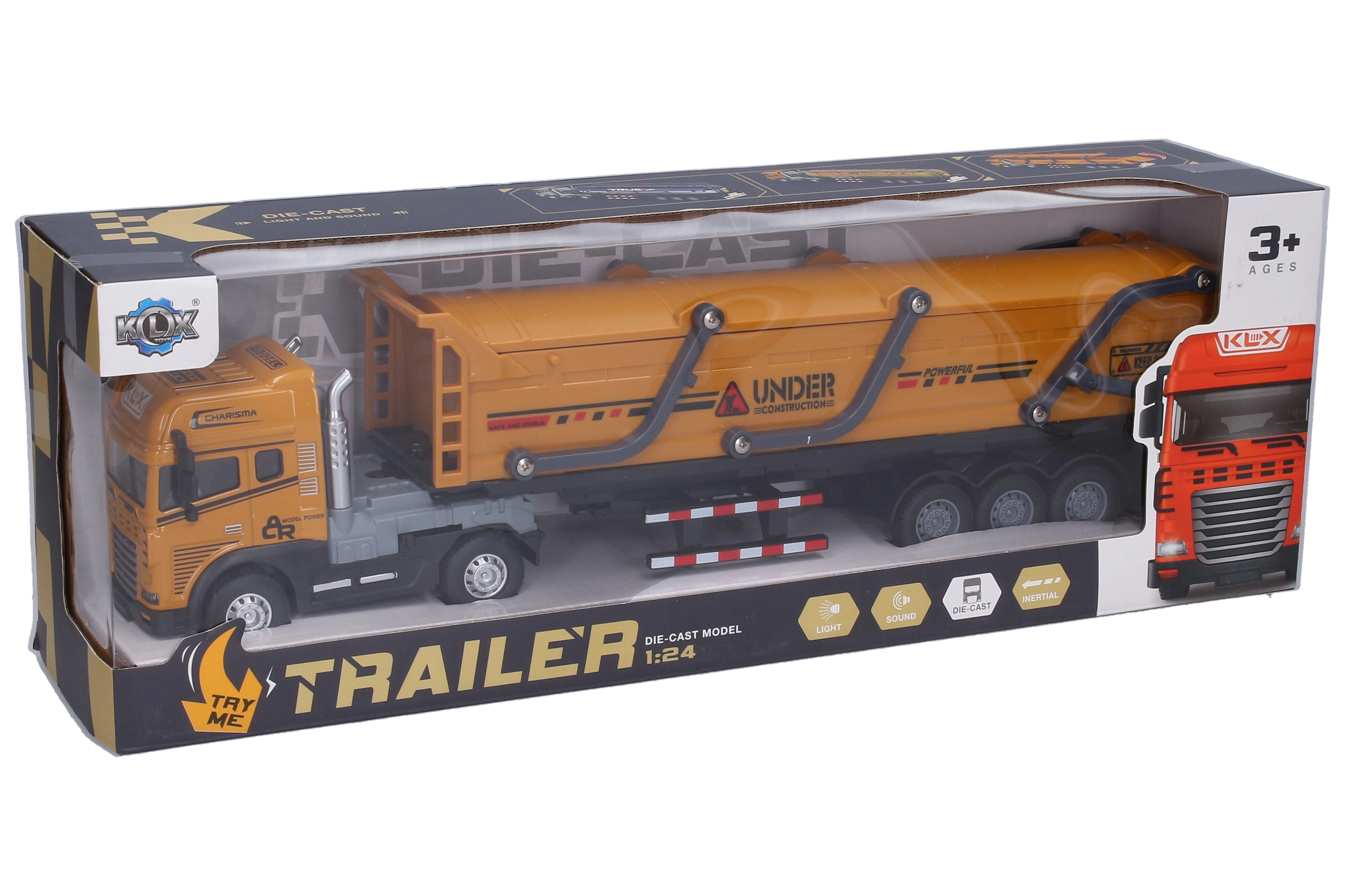 Izturīgs metāla vilcējs ar pašizgāzēja puspiekabi iepriecinās mazos vadītājus ar reālistisku izpildījumu un funkcijām. Tas piedāvā inerces piedziņu vienmērīgai braukšanai, gaismas un skaņas efektus ar aktivizēšanu, kustinot priekšējos riteņus, kā arī praktisku sviru puspiekabes nofiksēšanai. Puspiekabi var viegli atvienot. Baterijas 3× AG13 ir iekļautas komplektā.