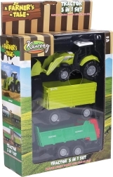 - Traktors, 2× piekabe (apm. 15 × 6 × 7 cm katra)
