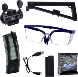 - želejlodes pistole MK7, 7,4 V Li akumulators, USB kabelis, 2 aptveres, optiskais tēmēklis, aizsargbrilles, taktiskais laidnis, iepakojums ar izmērcējamām želejlodēm, oriģinālā kaste