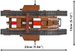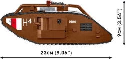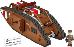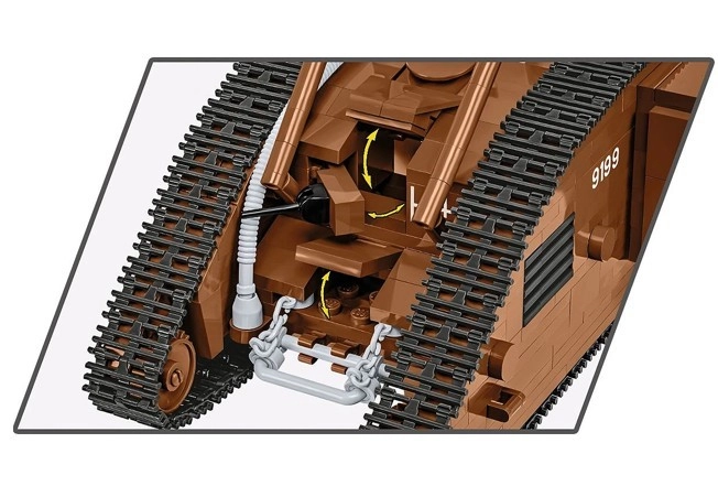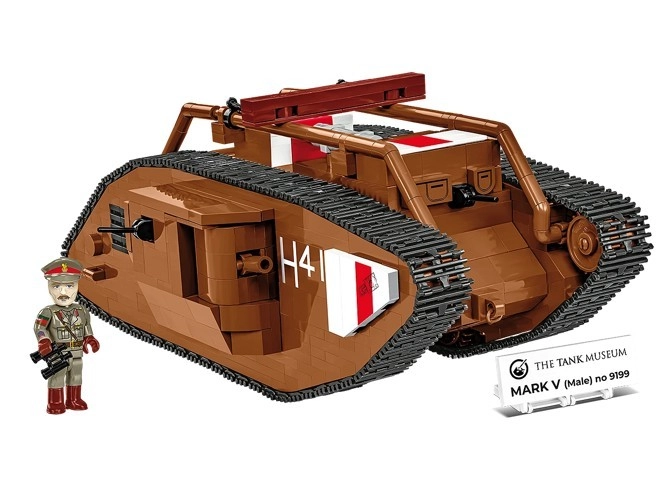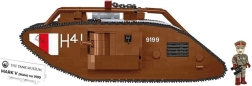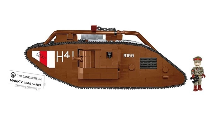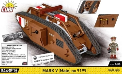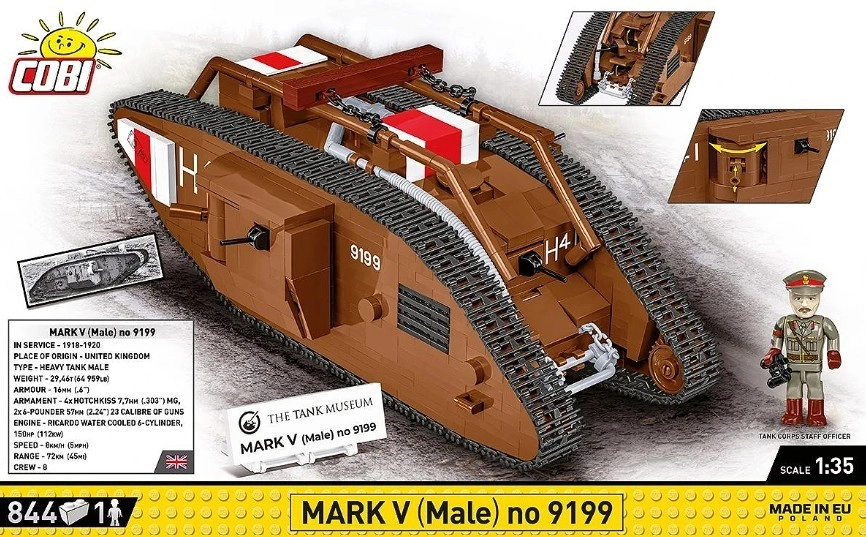 Uzbūvē ikonisko britu tanku MARK V (Male) mērogā 1:35 no 844 kvalitatīvām detaļām COBI. Modelim ir kustīgas kāpurķēdes, griežami lielgabali, atverami lūci un britu virsnieka figūriņa. Ideāli piemērots militārās vēstures entuziastiem un kolekcionāriem.