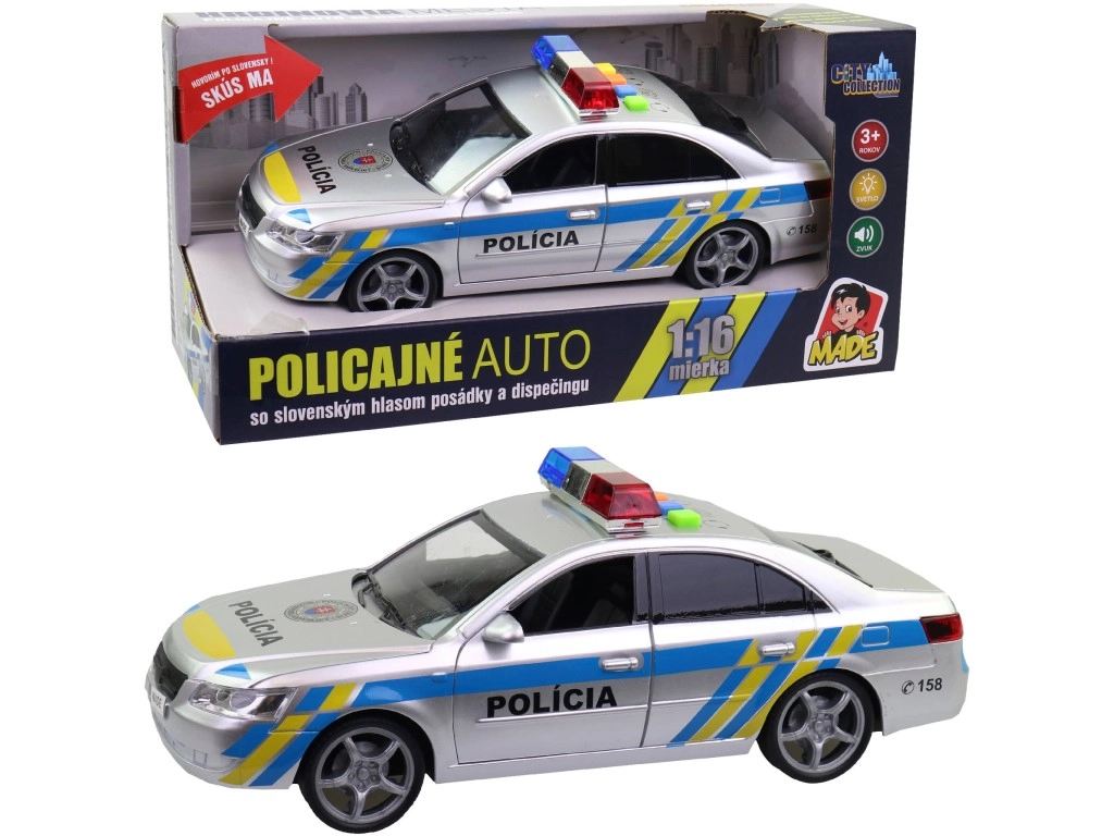 Reālistsks policijas auto slovāku dizainā ar slovāku valodas balss paziņojumiem ekipāžas un dispečera izpildījumā un darbojošos gaismas bākuguni. Piedāvā skaņas efektus, autentiskus izsaukumu paziņojumus un kompakto izmēru, ideāli piemērots spēlēm mājās un ārā.