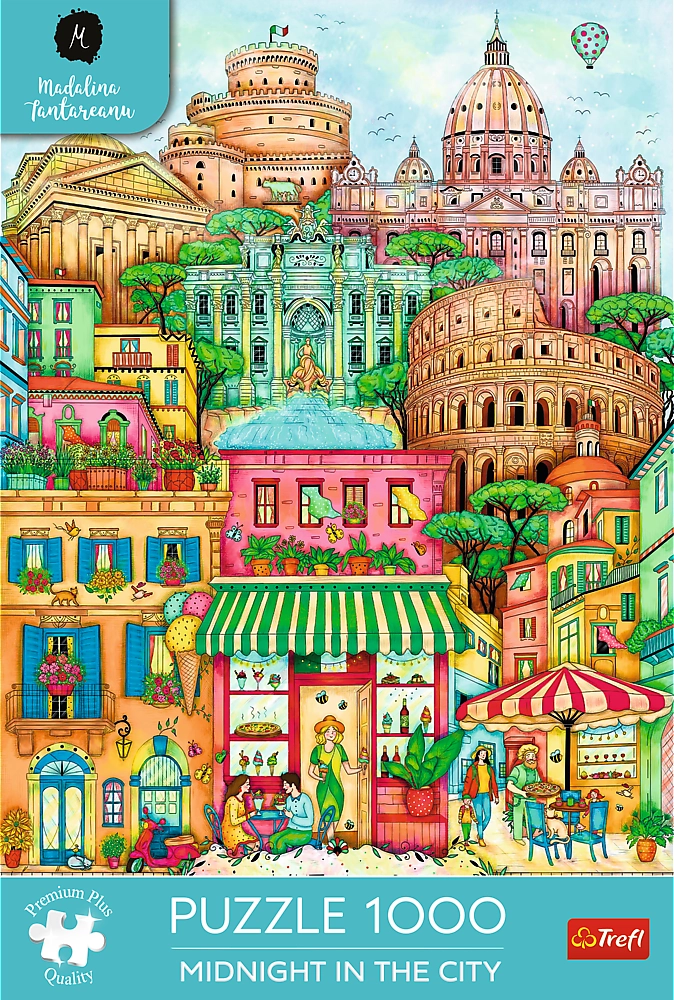 Izbaudiet kvalitatīvu un patīkamu salikšanu ar TREFL Premium Plus puzlēm – motīvs Pusnakts Romā ienes romantisku vēsturiskās pilsētas nakts noskaņu. Pateicoties paaugstinātajam kartona biezumam un izturībai, saliktās daļas labi turas kopā, tāpēc pabeigtas sekcijas varat viegli pārvietot.